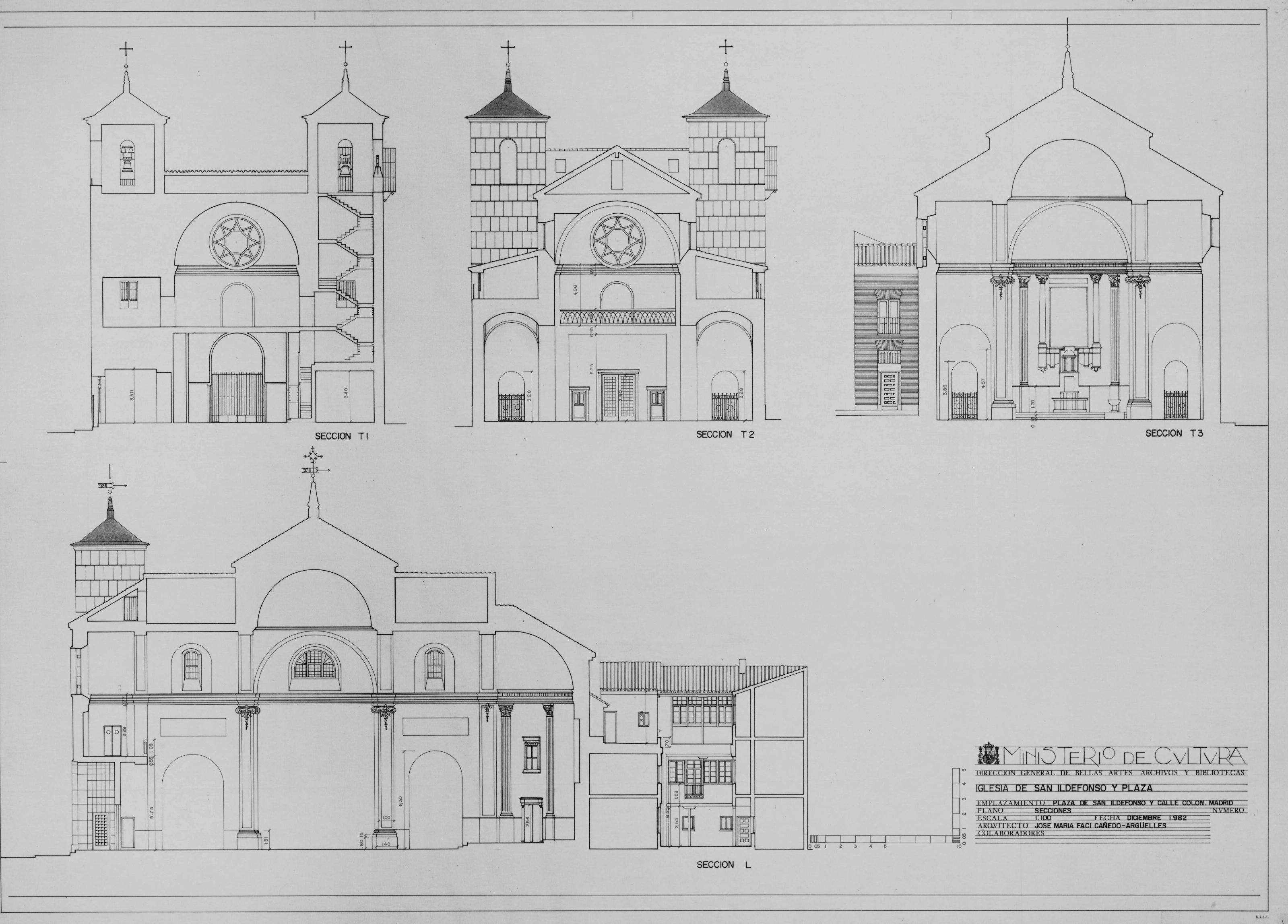 IGLESIA DE SAN ILDEFONSO Y PLAZA.: SECCIONES ACOTADAS. Planos con tres secciones transversales y una sección longitudinal, dibujados con detalles. Emplazamiento a plaza de San Ildefonso y calle Colón. Plano con cotas.