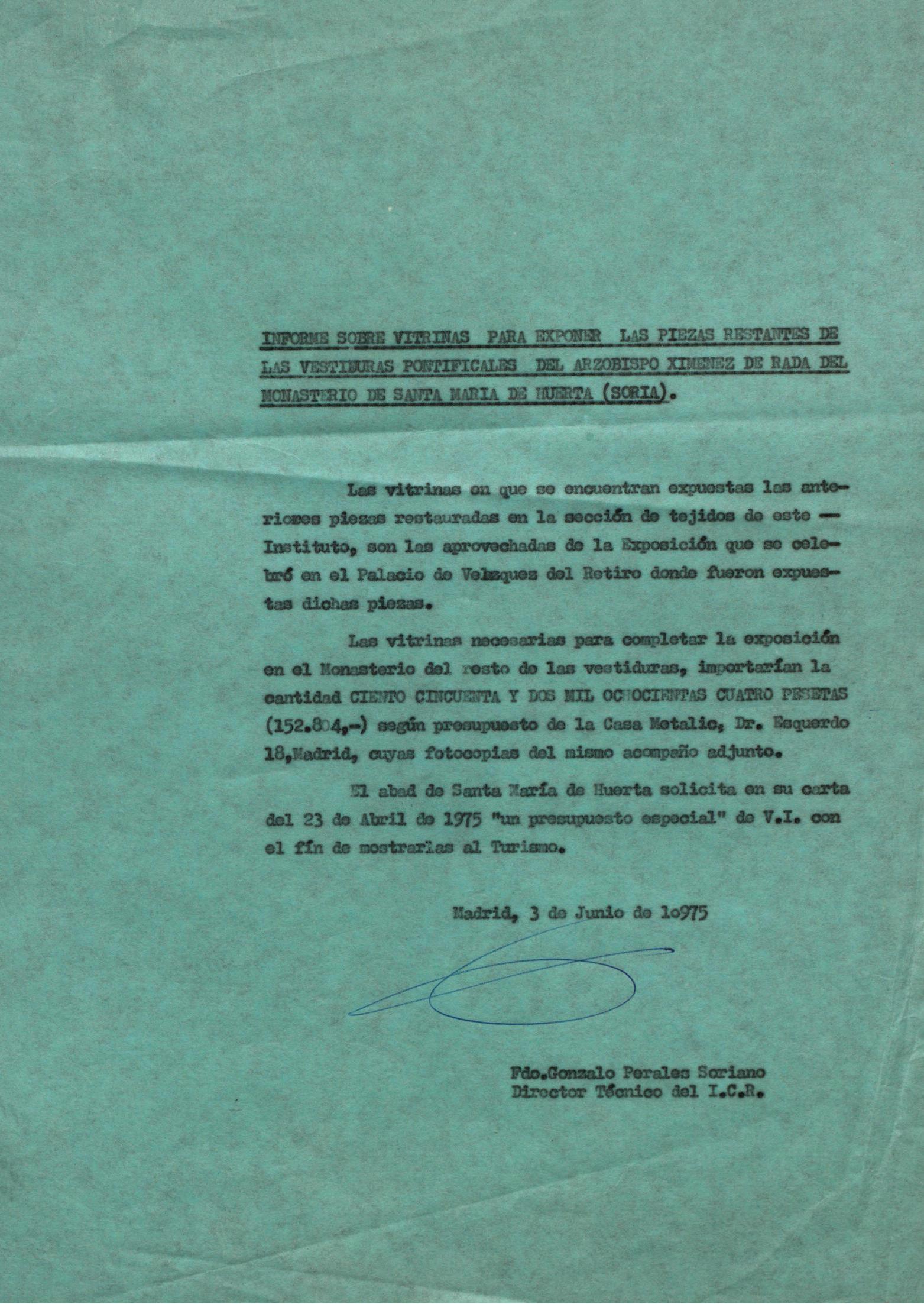 Informe sobre las vitrinas para exponer las piezas de las vestiduras pontificales del arzobispo Rodrigo Jiménez de Rada, procedente del Monasterio de Santa María de Huerta (Soria)