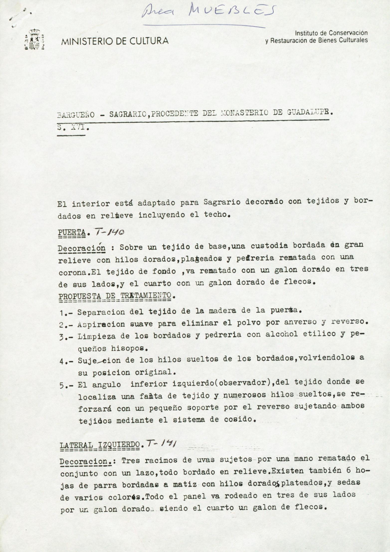 Restauración del tejido de un escritorio, actualmente sagrario de Felipe II, procedente del Real Monasterio de Guadalupe (Cáceres)