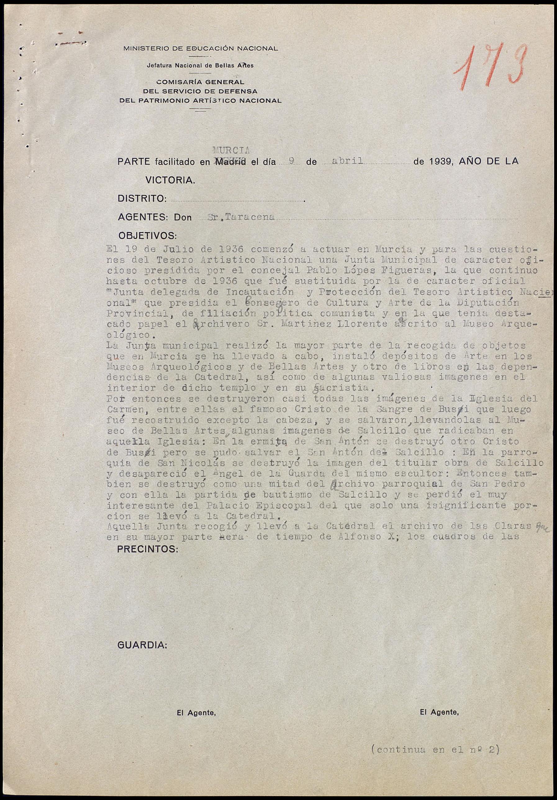 Informe sobre la situación de los objetos artísticos de la ciudad de Murcia a lo largo de la contienda