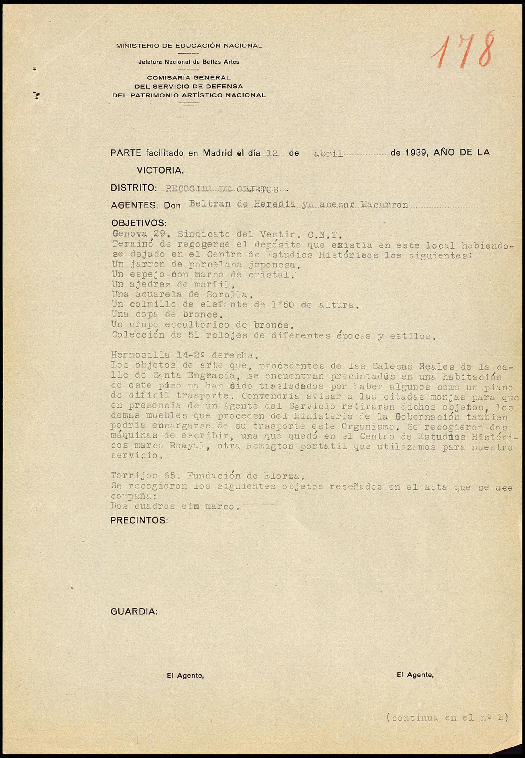 Visitas realizadas por los agentes al Sindicato del Vestir de la CNT, a un domicilio particular con objetos del Monasterio de los Salesas Reales, Fundación Elorza, Palacio de los Marqueses de Villagonzalo y Convento de la Magdalena