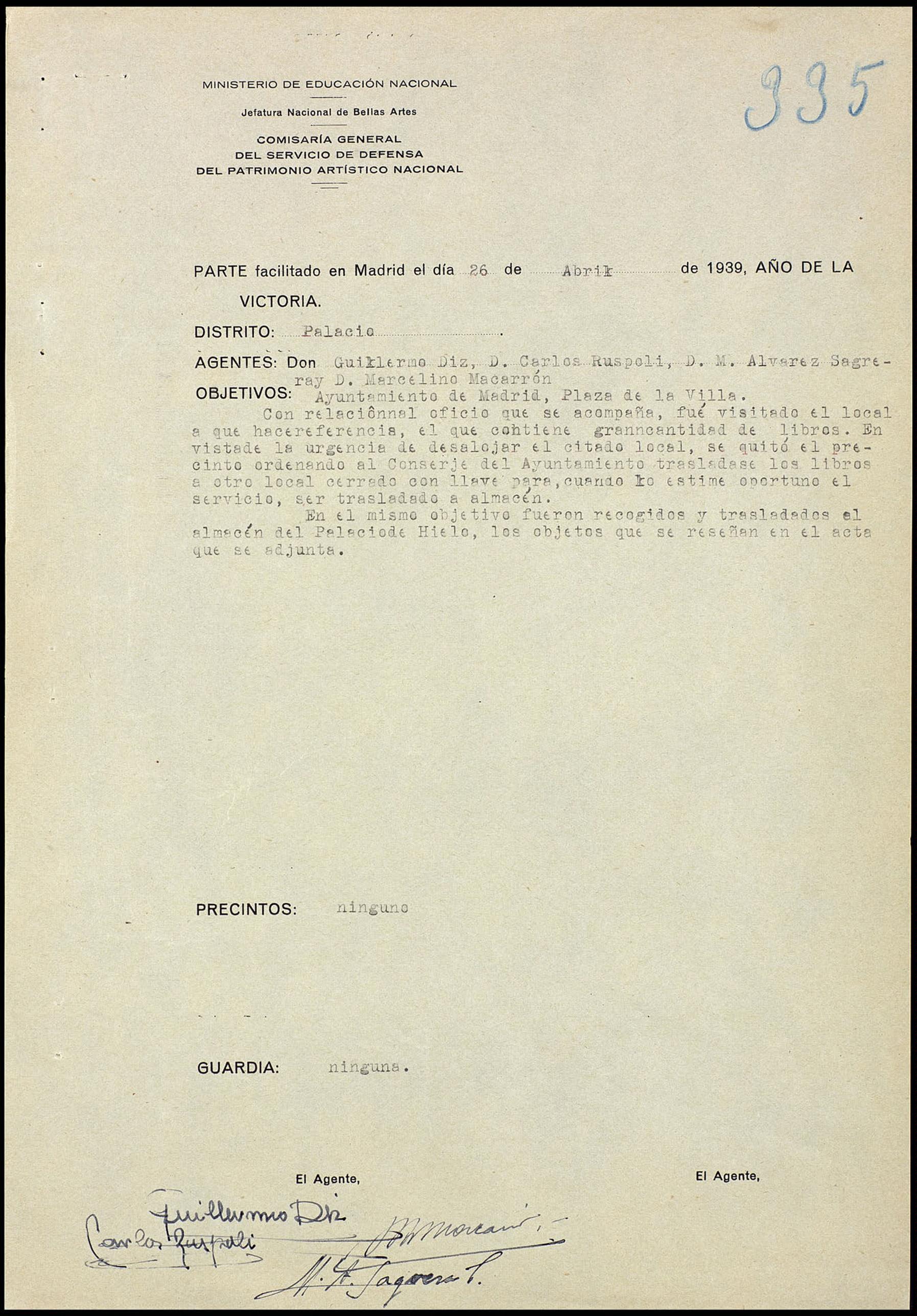 Visitas realizadas por los agentes al edificio del Ayuntamiento de Madrid en sus ubicaciones de la Plaza de la Villa y la Calle Velázquez y traslado de los objetos al Palacio de Hielo
