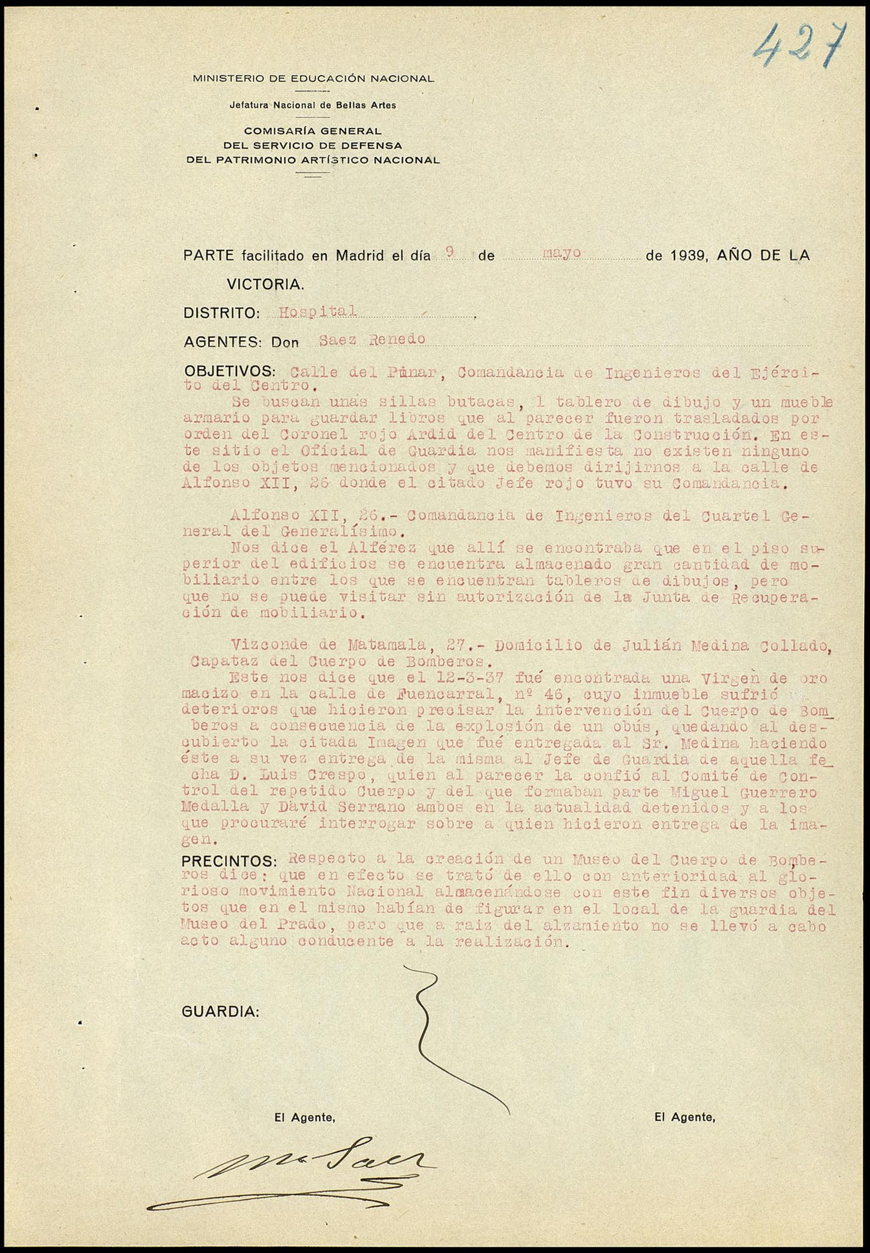 Visitas realizadas por los agentes a la Comandancia de Ingenieros del Ejercito del Centro, a la Comandancia de Ingenieros del Cuartel General y al domicilio de Juan Medina Collado