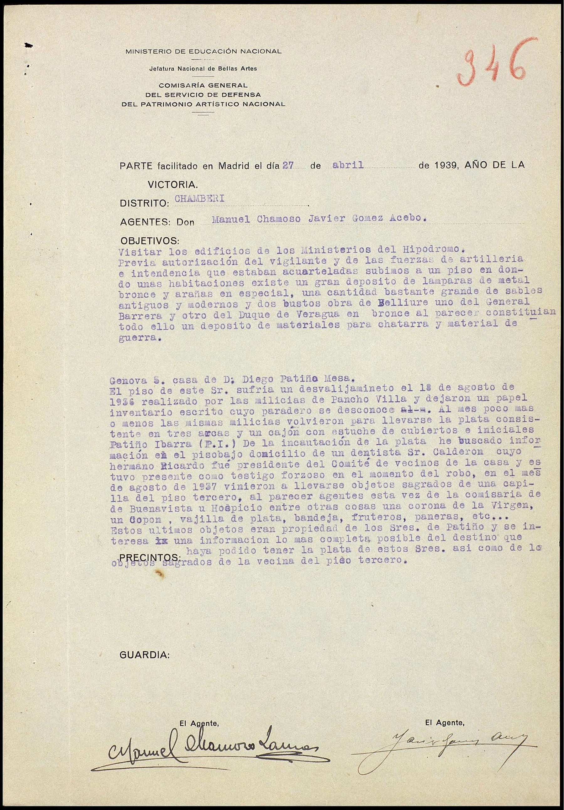 Visitas realizadas por los agentes a los edificios de los Ministerios del Hipódromo y a la casa de Diego Patiño