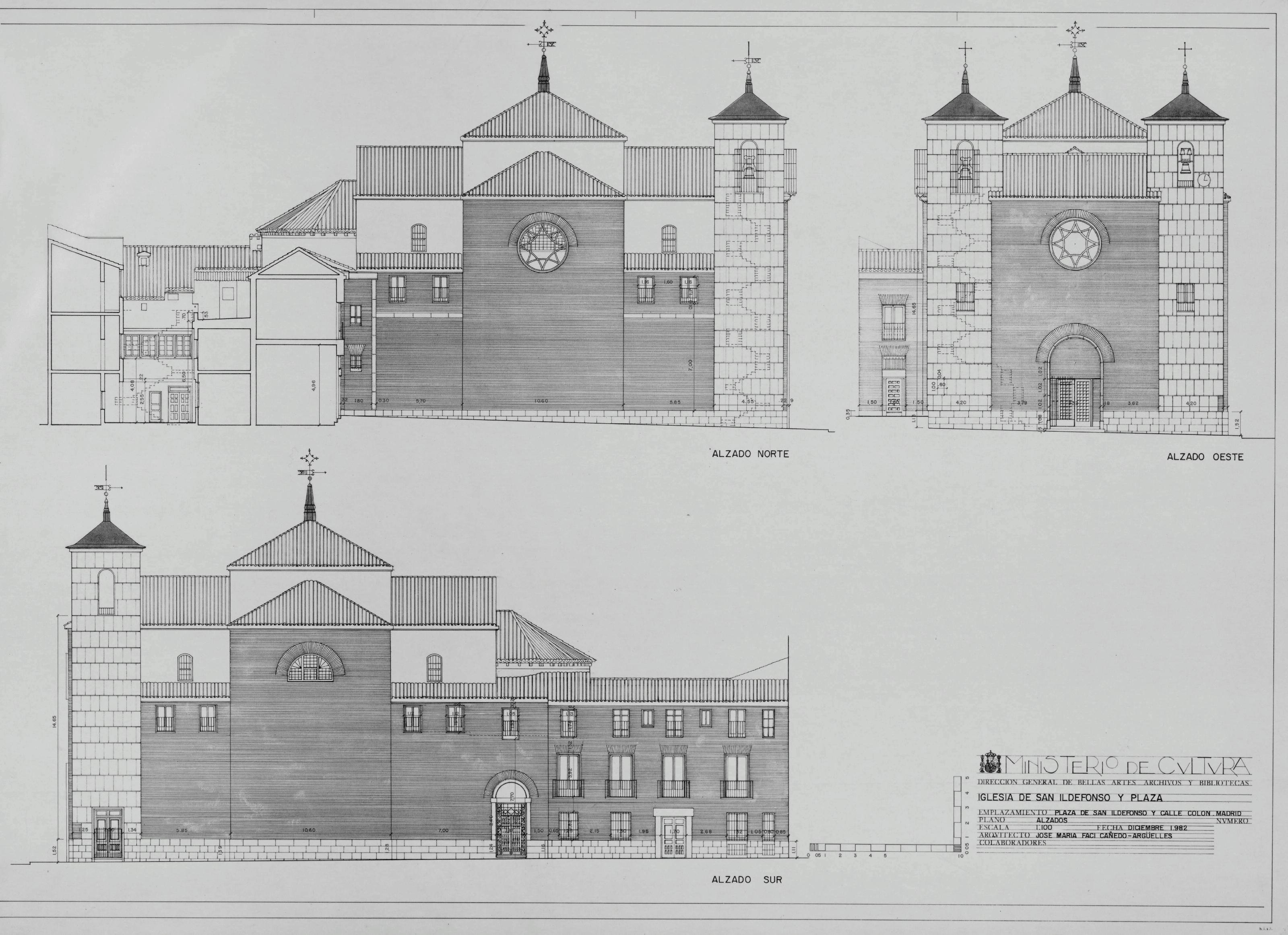 IGLESIA DE SAN ILDEFONSO Y PLAZA.: ALZADOS ACOTADOS: NORTE, OESTE, Y SUR. Planos dibujados con detalle. Emplazamiento a plaza de San Ildefonso y calle Colón. Plano sin cotas.