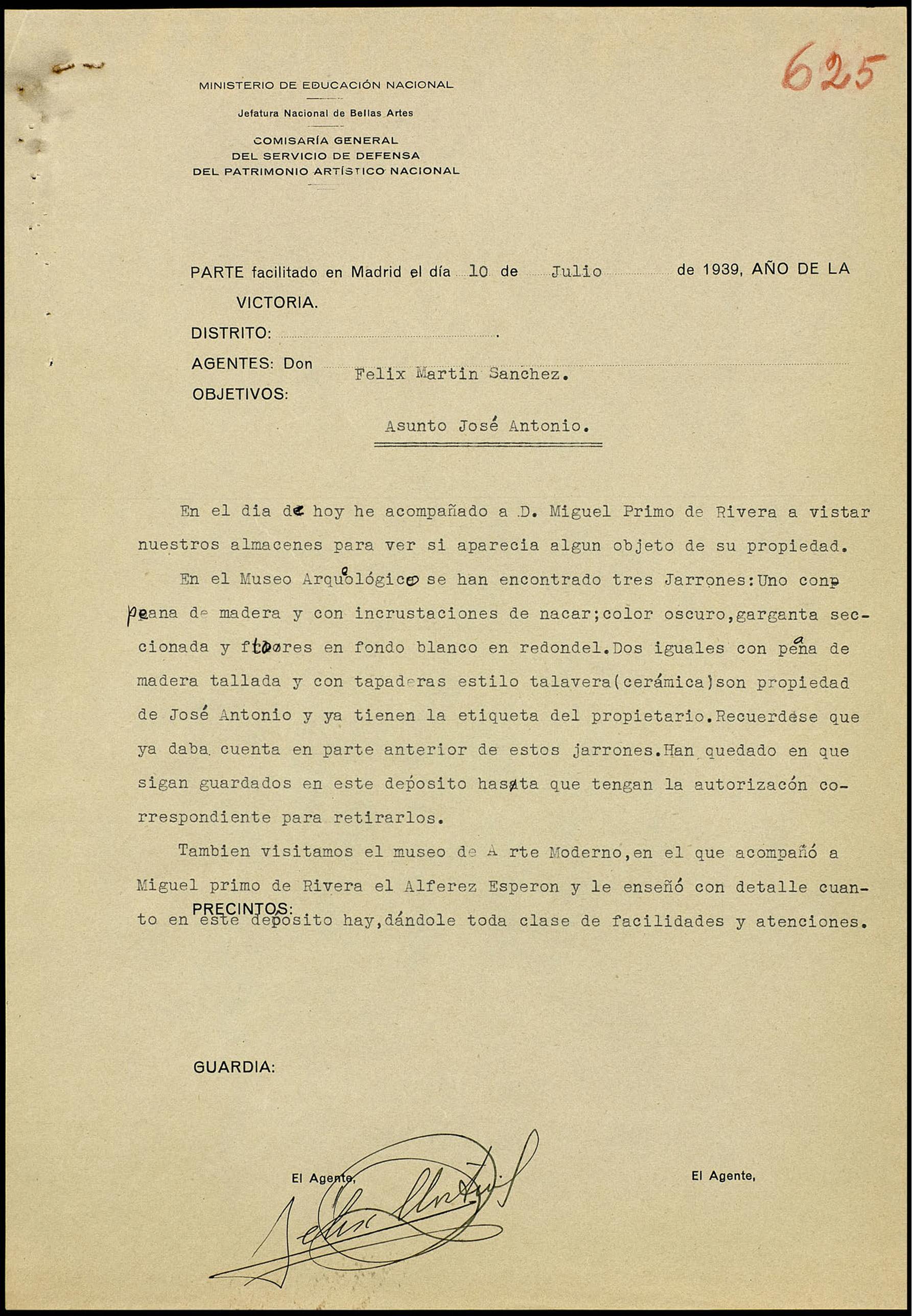 Visitas realizadas por los agentes con Miguel Primo de Rivera para localizar en los almacenes objetos de su propiedad o de la de José Antonio Primo de rivera