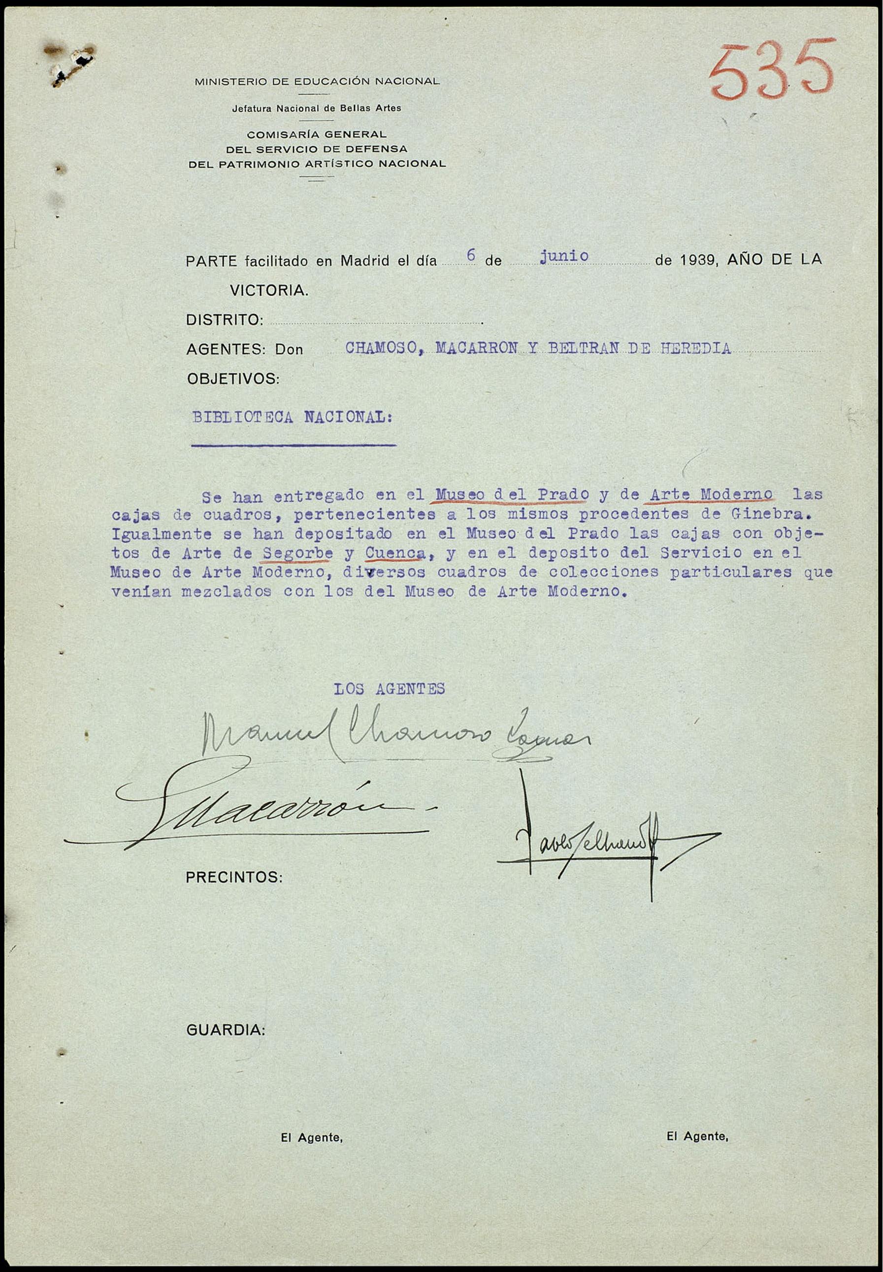Visitas realizadas por los agentes al Museo del Prado y de Arte Moderno para entregar las cajas de cuadros de su propiedad procedentes de Ginebra