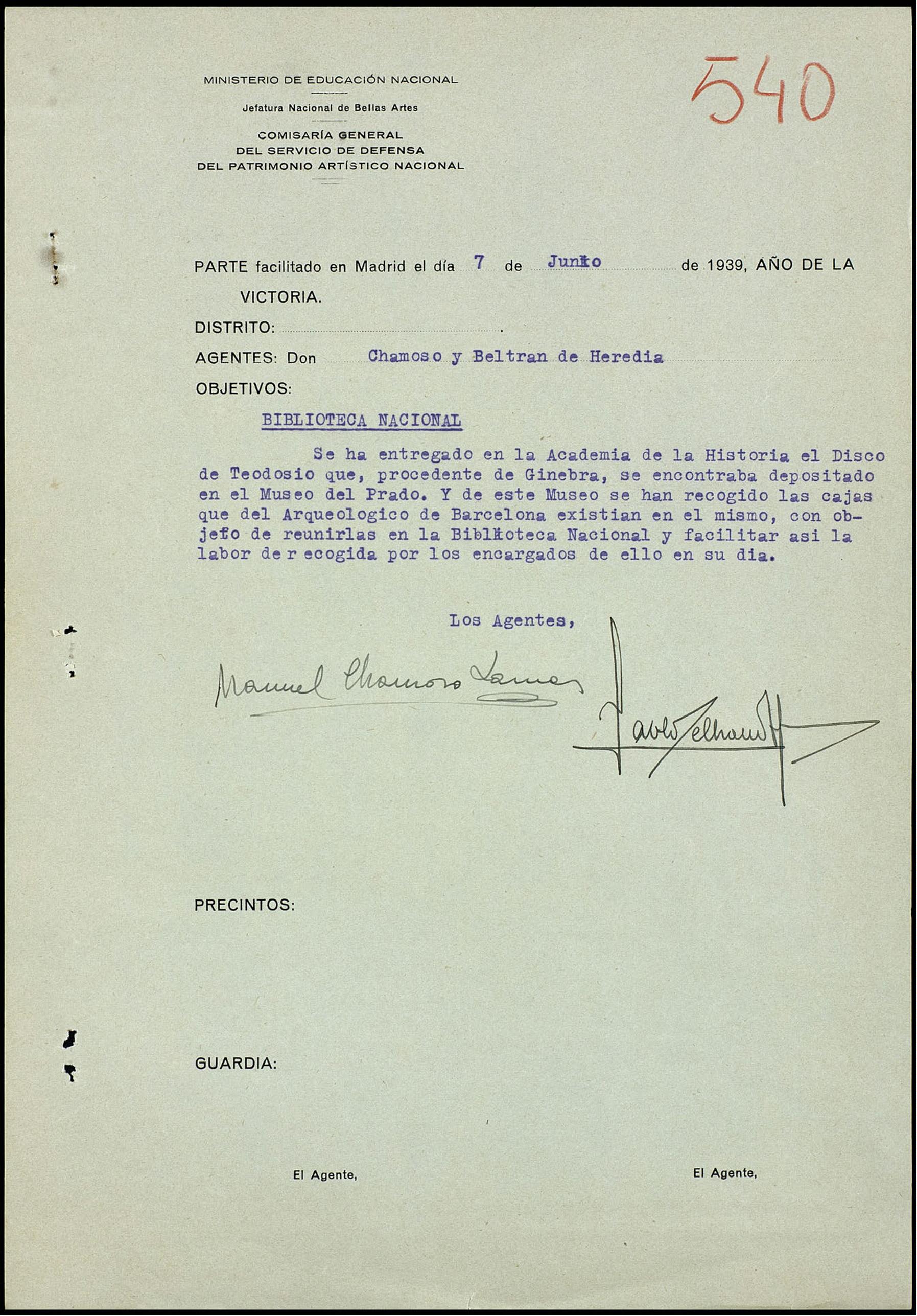 Visitas realizadas por los agentes al Museo del Prado para recoger del Tesoro Artístico procedente de Ginebra, el Disco de Teodosio y las cajas del Museo Arqueológico de Barcelona para facilitar su devolución