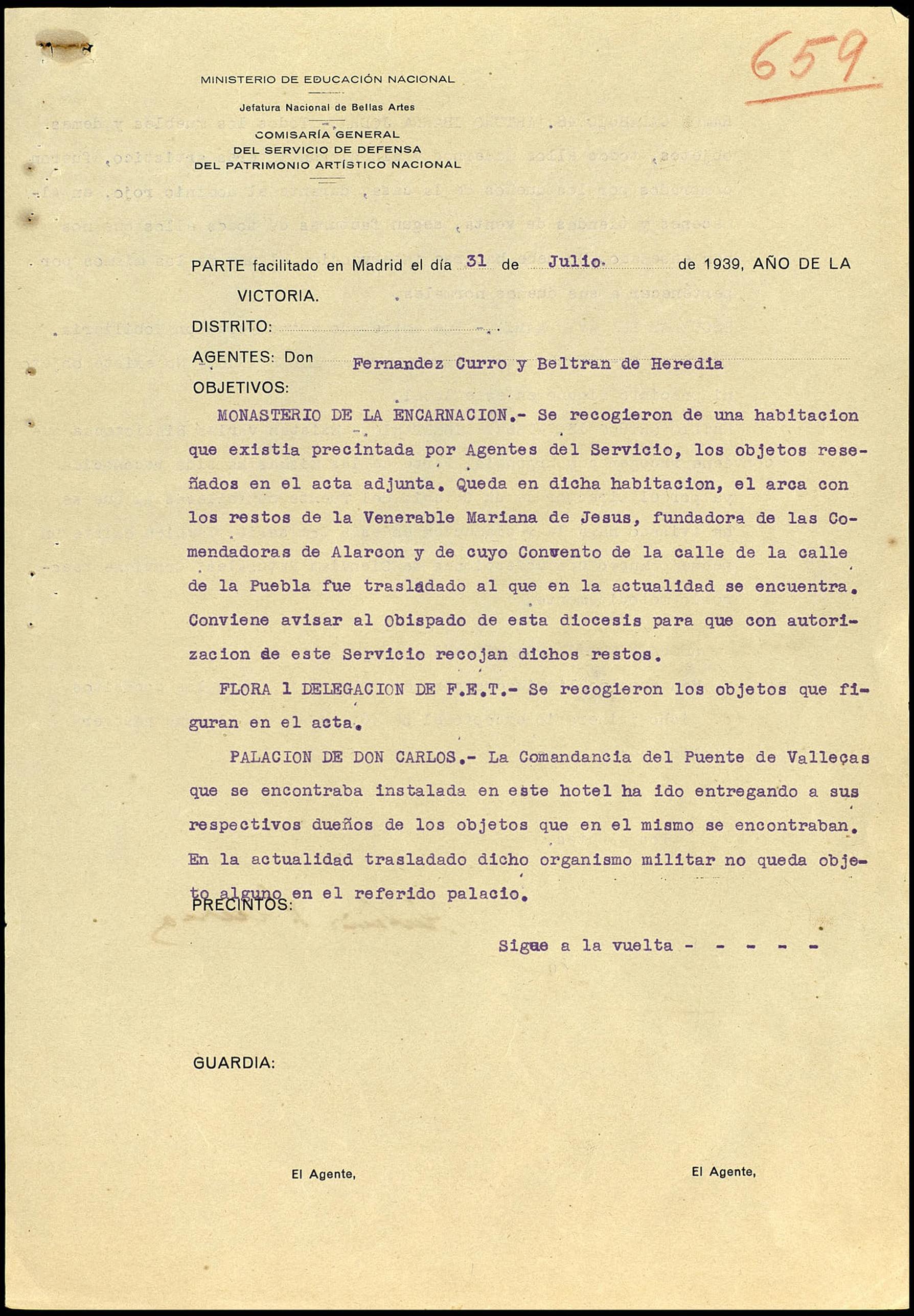 Visitas realizadas por los agentes al Monasterio de la Encarnación, a la Delegación de Falange Española Tradicionalista y al Palacio de Don Carlos