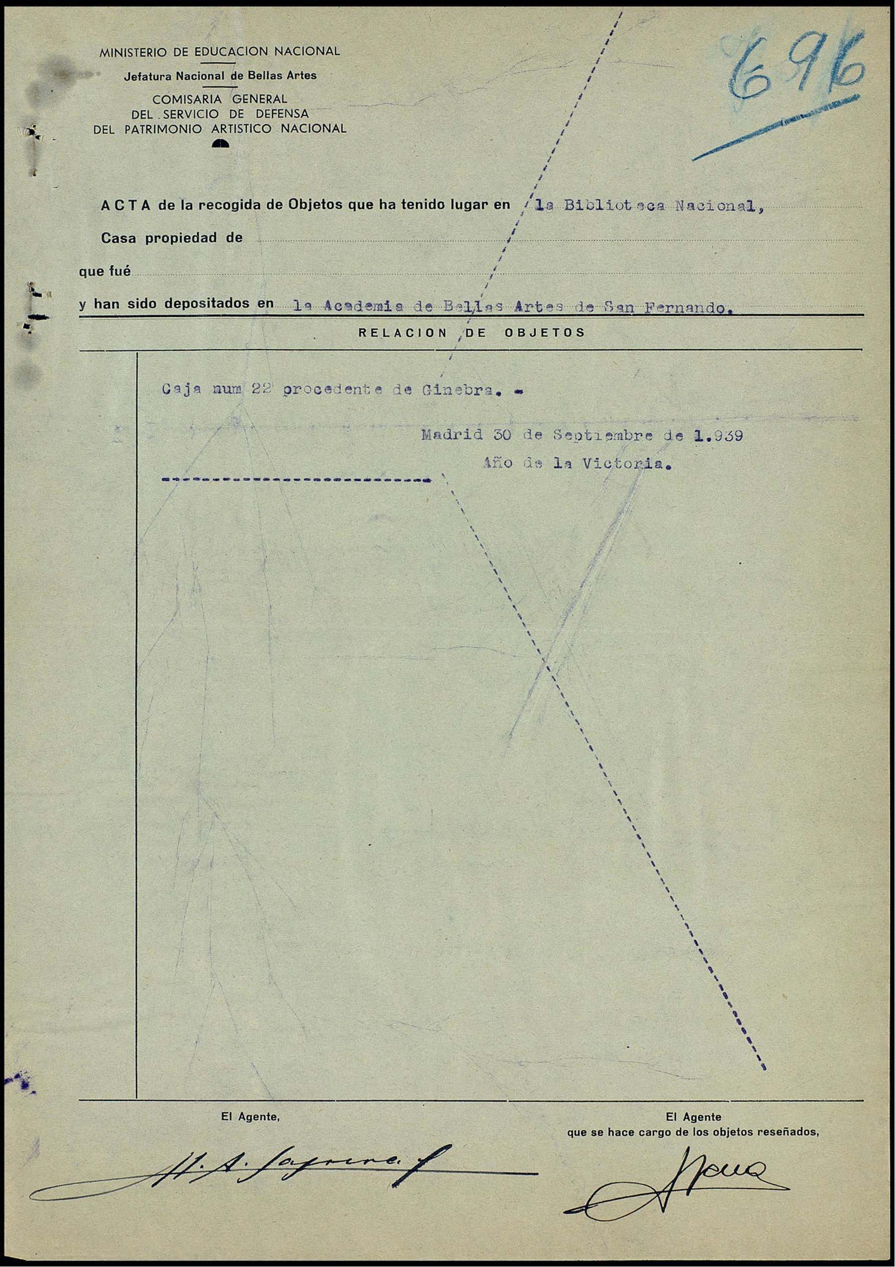 Acta de la recogida de objetos de la Biblioteca Nacional, depositados en la Academia de Bellas Artes de San Fernando