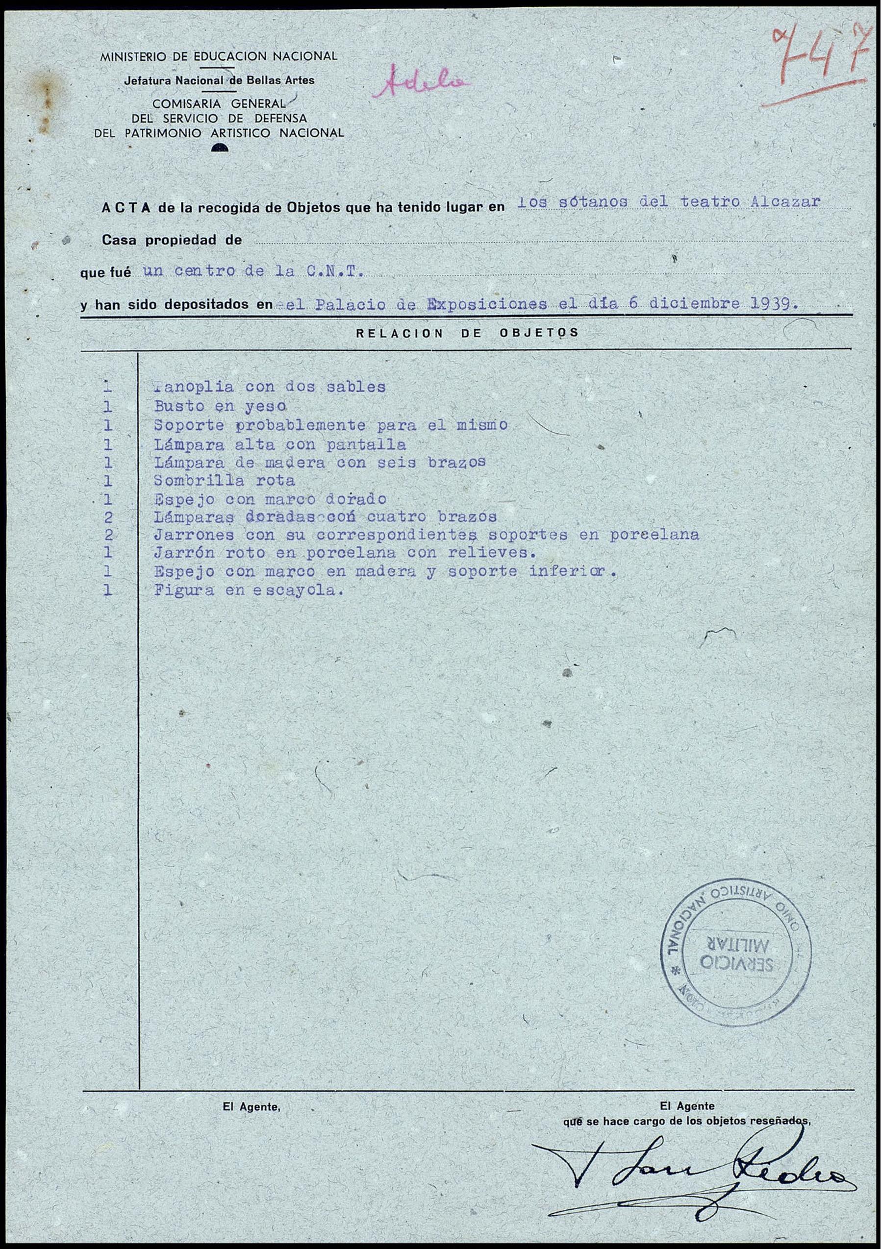 Acta de la recogida de objetos en los sótanos del Teatro Alcázar, depositados en el Palacio de Exposiciones