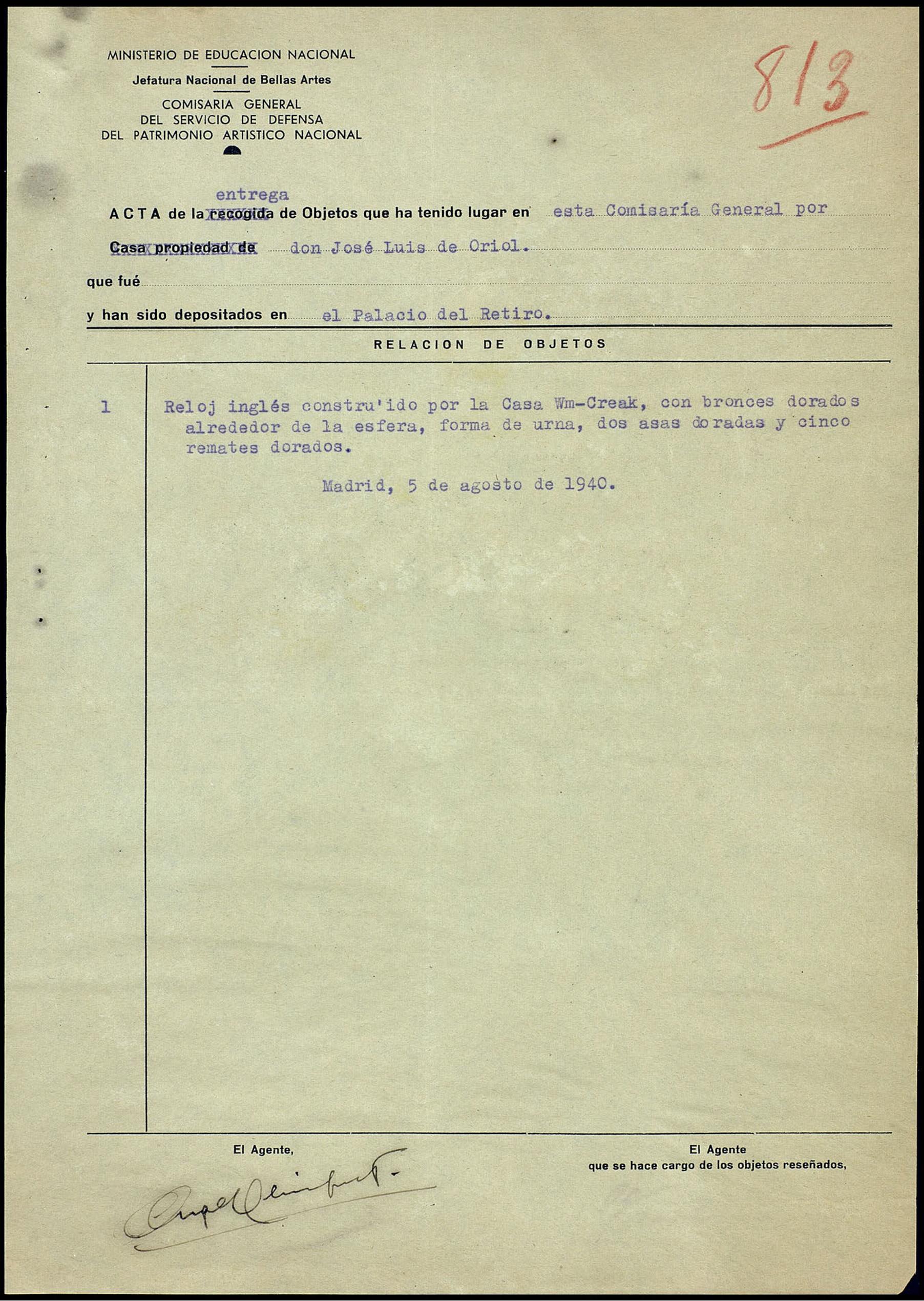 Acta de la entrega en la Comisaria General de un reloj con bronces dorados efectuada por José Luis de Oriol
