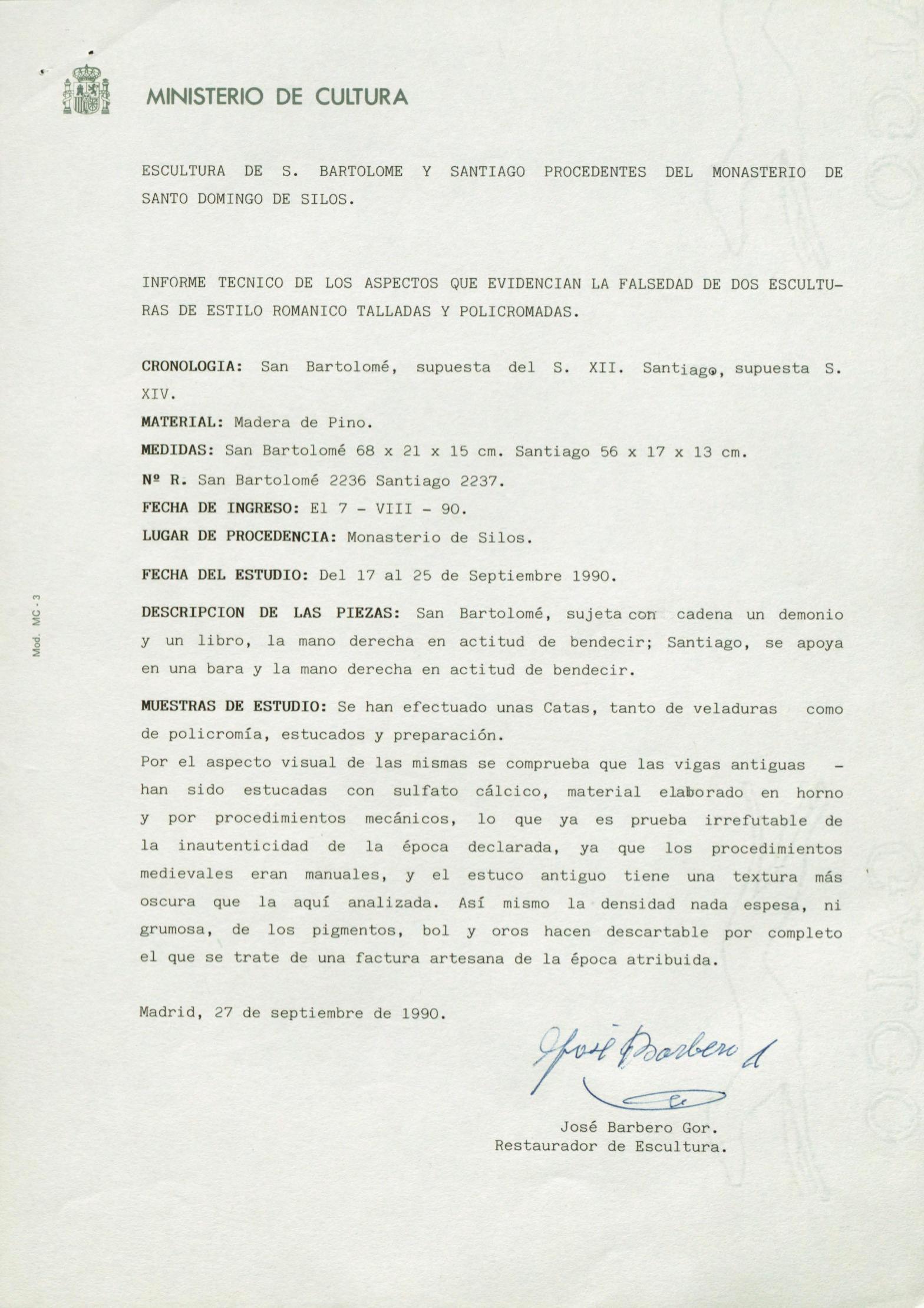 Informe sobre la posible falsedad de dos tallas de madera policromada de San Bartolomé y Santiago procedentes del Monasterio de Santo Domingo de Silos (Burgos)