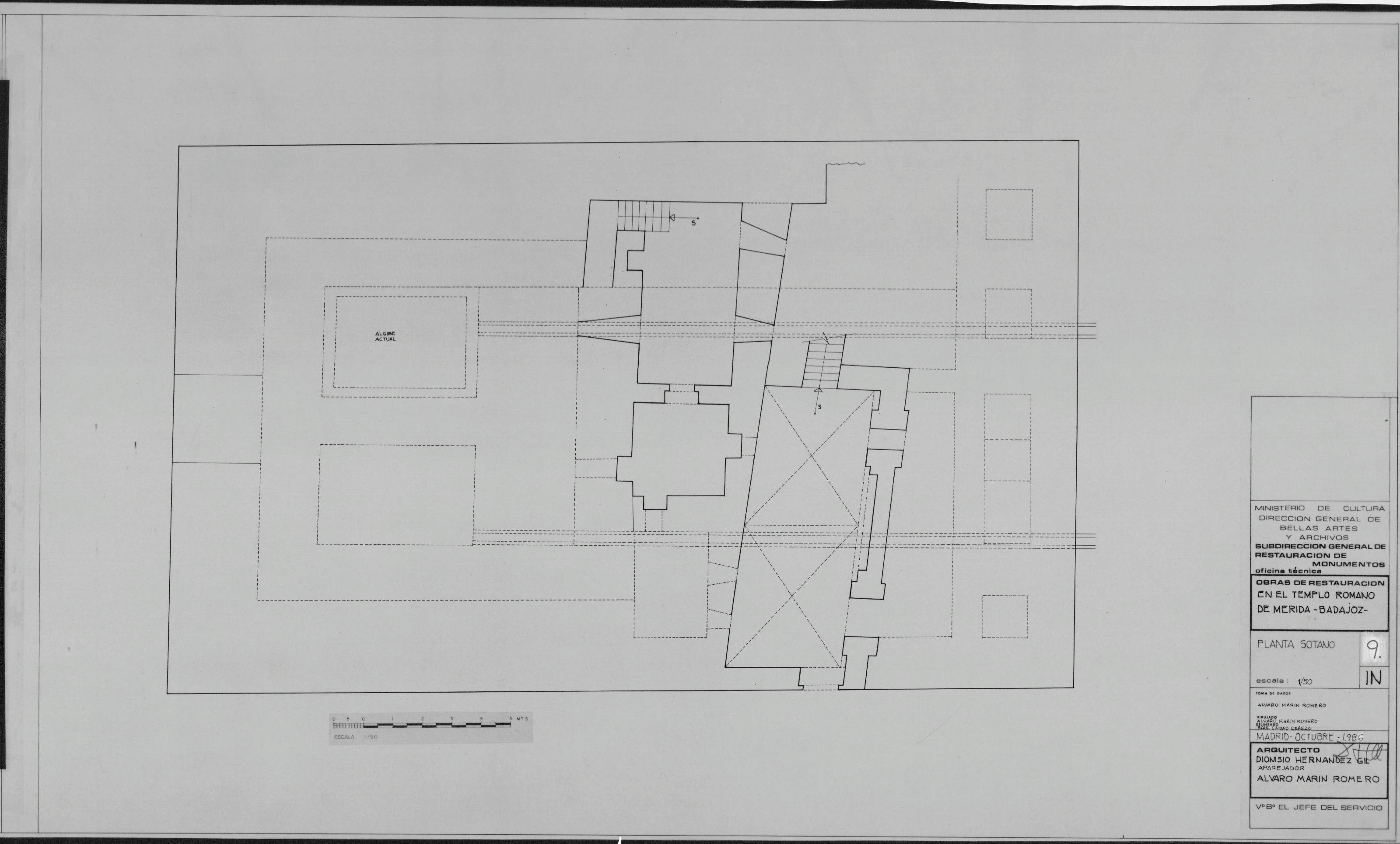 OBRAS DE RESTAURACION EN EL TEMPLO ROMANODE MERIDA (Badajoz): PLANTA SOTANOCon situación de AlgibeCon escala gráfica . Firmado