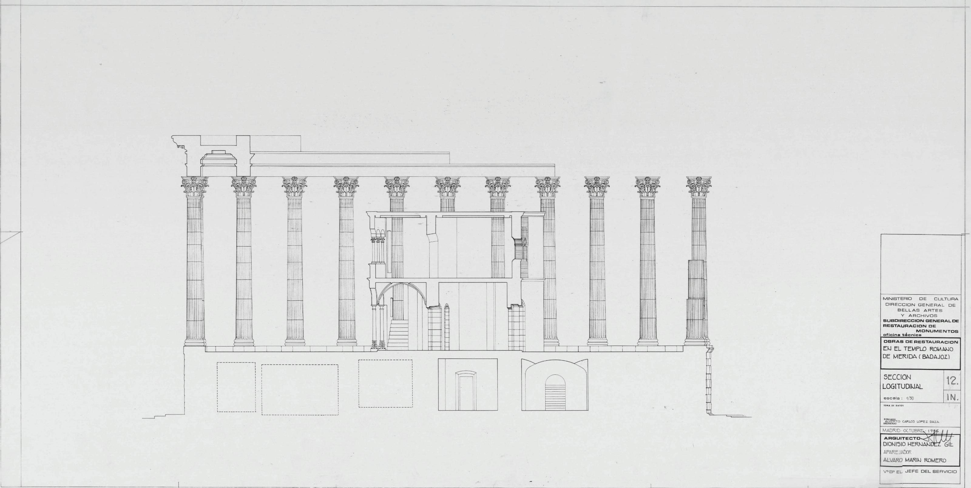 OBRAS DE RESTAURACION EN EL TEMPLO ROMANO DE MERIDA (Badajoz): SECCION LONGITUDINAL Sin notas ni cotas pero dibujado con gran detalle Firmado