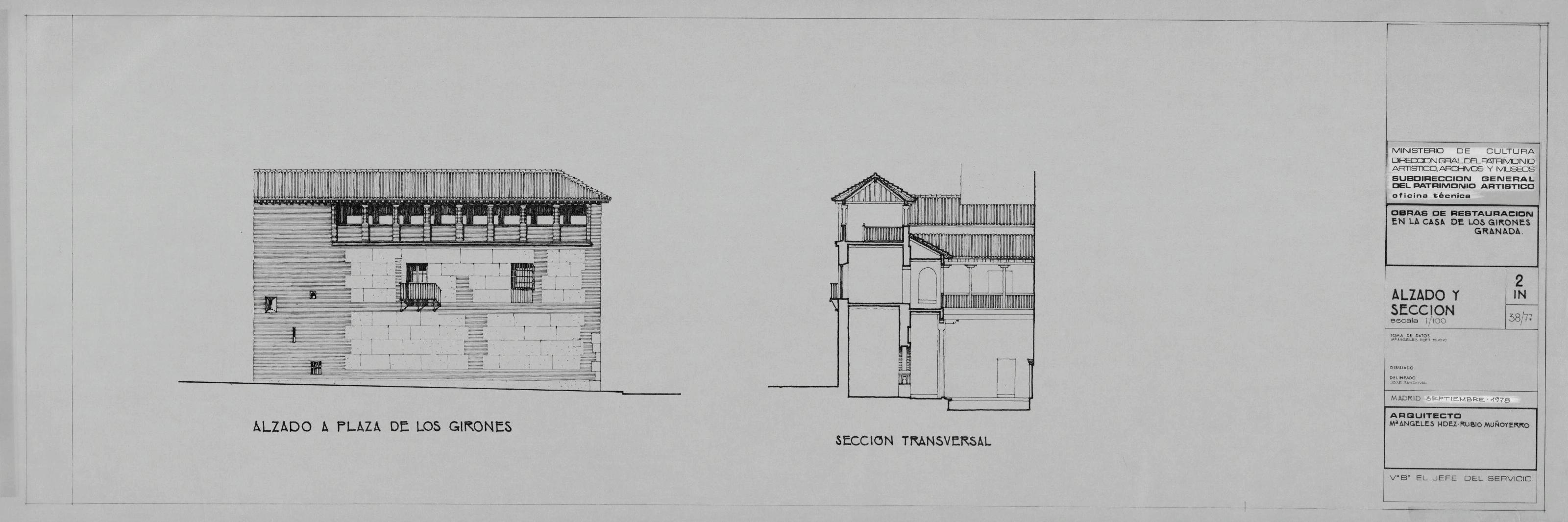 CASA DE LOS GIRONES - GRANADA-: ALZADO a plaza de los girones. SECCION.Transversal Planos de distribucion, plano sin acotar.