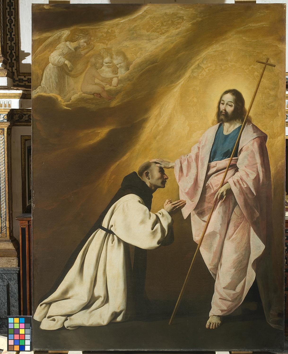 Fotografías del lienzo de Francisco de Zurbarán "Aparición de Jesús al padre Andrés Salmerón", perteneciente a la "Serie de monjes menores Jerónimos", de la sacristía del Monasterio de Guadalupe (Cáceres)