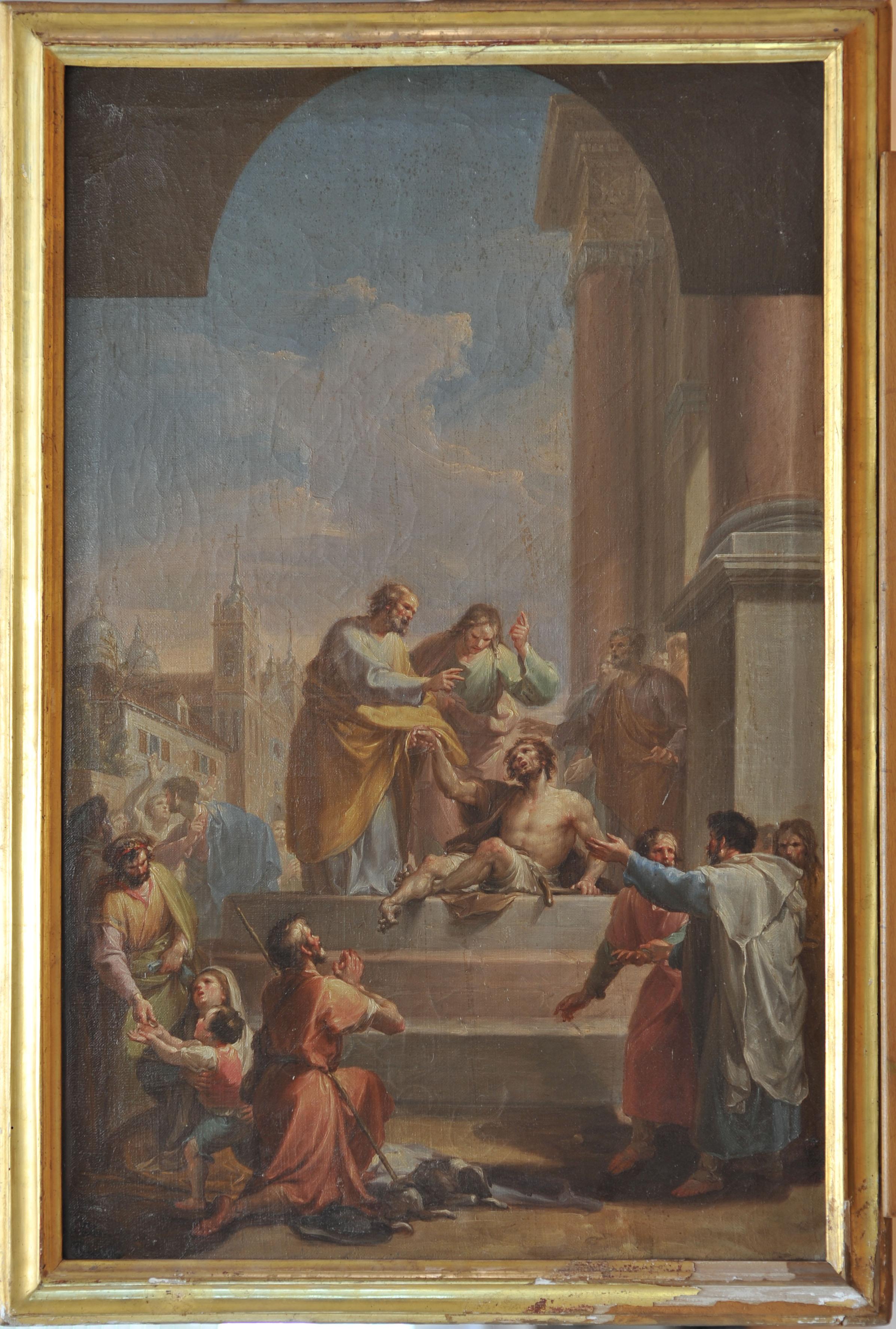 Fotografías del boceto de los frescos del siglo XVIII "Curación de san Pedro al paralítico al entrar en el templo acompañado de san Juan", de Francisco Bayeu, del claustro de la Catedral de Toledo
