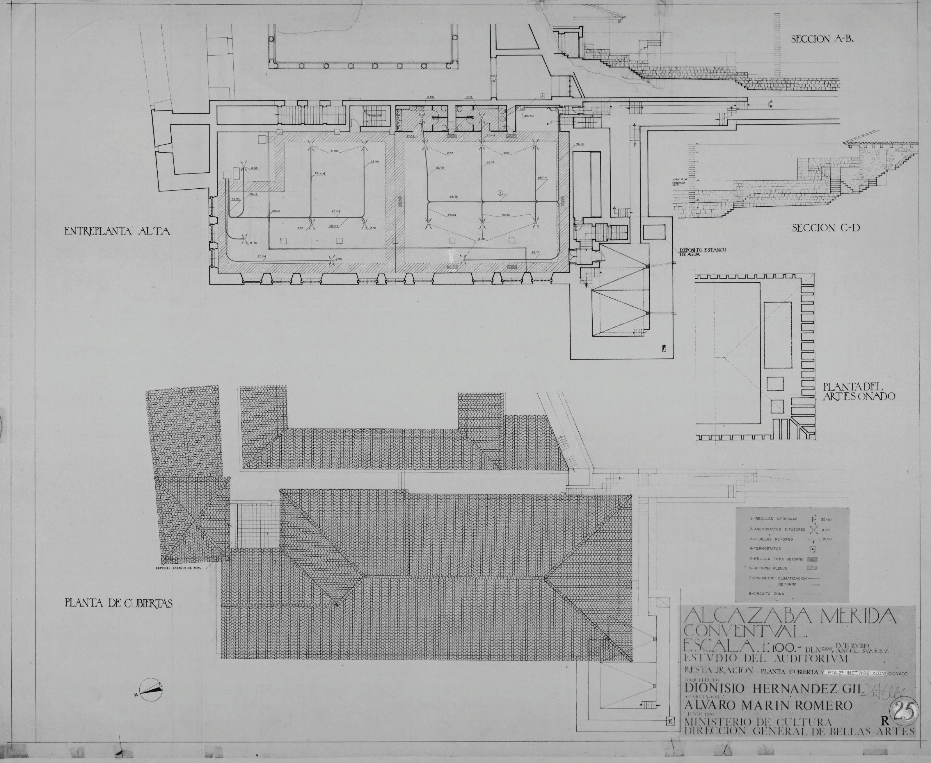 ALCAZABA DE MERIDA (Badajoz) Estudio del Auditorium: PLANTA SEGUNDA Y PLANTA DE CUBIERTA - Restauración - Instalación Aire Acondicionado Con red de conductos y medida de rejillas. Marcando el retorno. Además de esta planta consta de una zona en planta de artesonado, dos secciones dadas por escaleras de acceso y planta de cubierta. Firmado