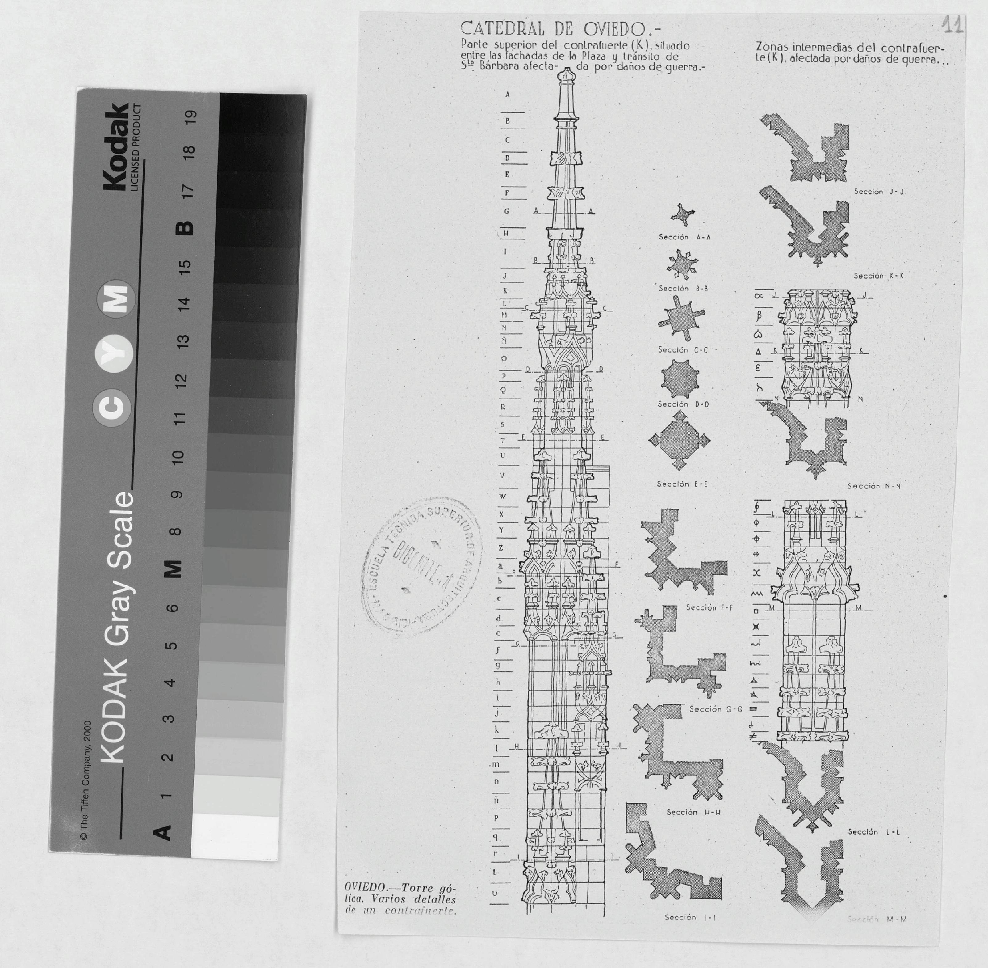 CATEDRAL DE OVIEDO: PARTE SUPERIOR DEL CONTRAFUERTE (k). SITUADO ENTRE LAS FACHADAS DE LA PLAZA Y TRANSITO DE SANTA BARBARA AFECTADO POR DAÑOS DE GUERRA.