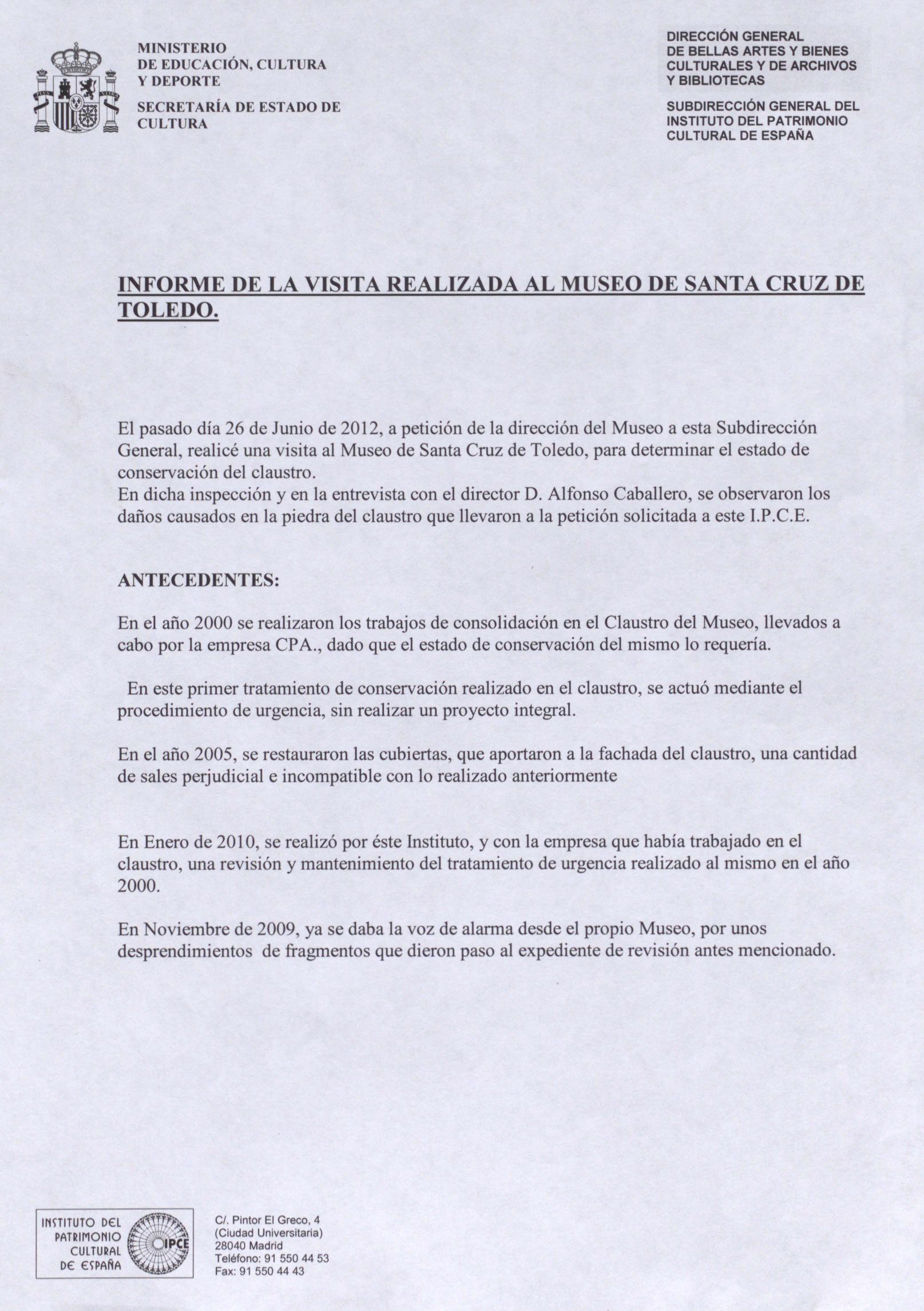 Informe de visita para el estado de conservación del claustro del Museo de Santa Cruz de Toledo