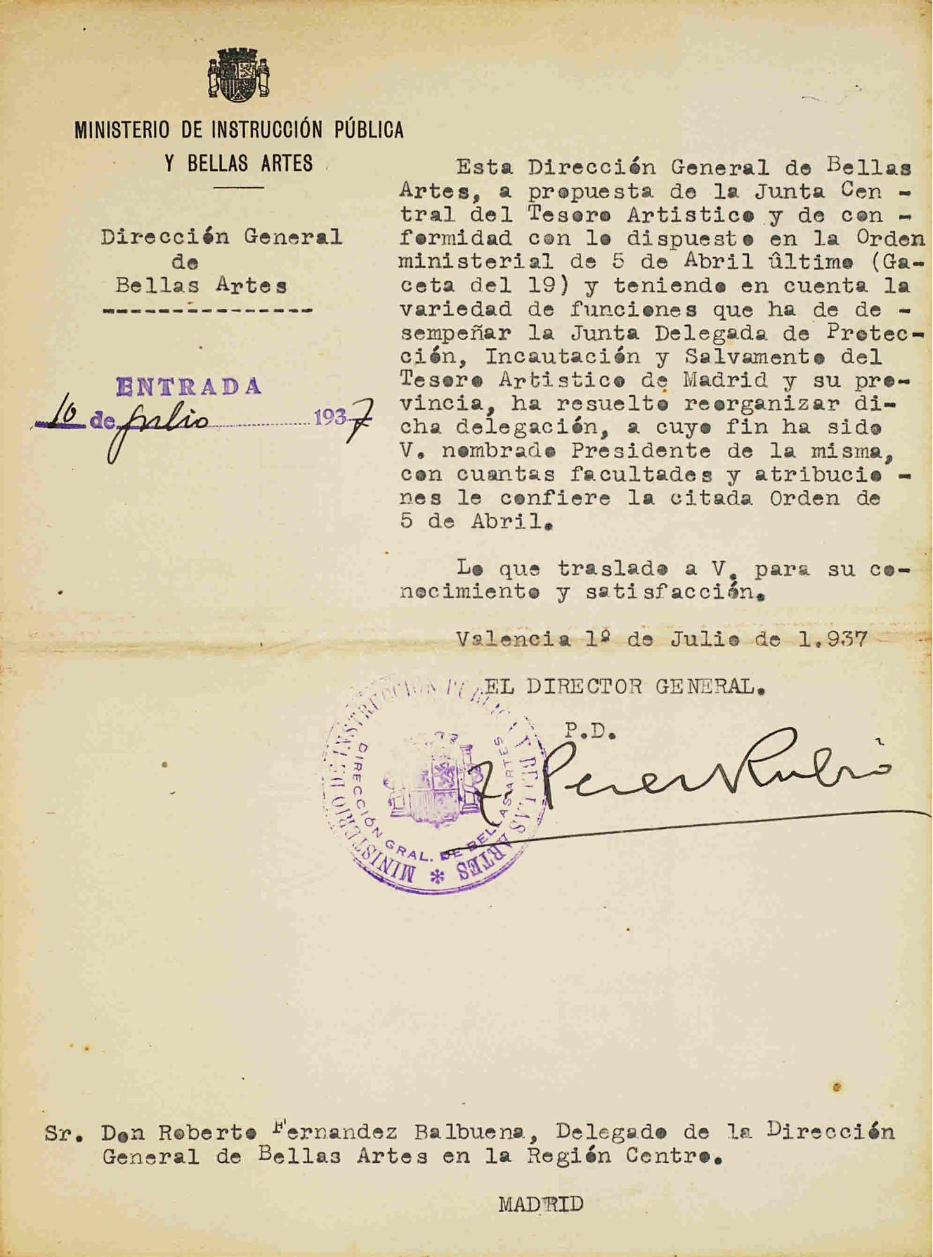 Oficio del Director General de Bellas Artes por delegación Timoteo Pérez Rubio, en el que notifican a Roberto F. B. su nombramiento como Presidente de la Junta Delegada de Madrid