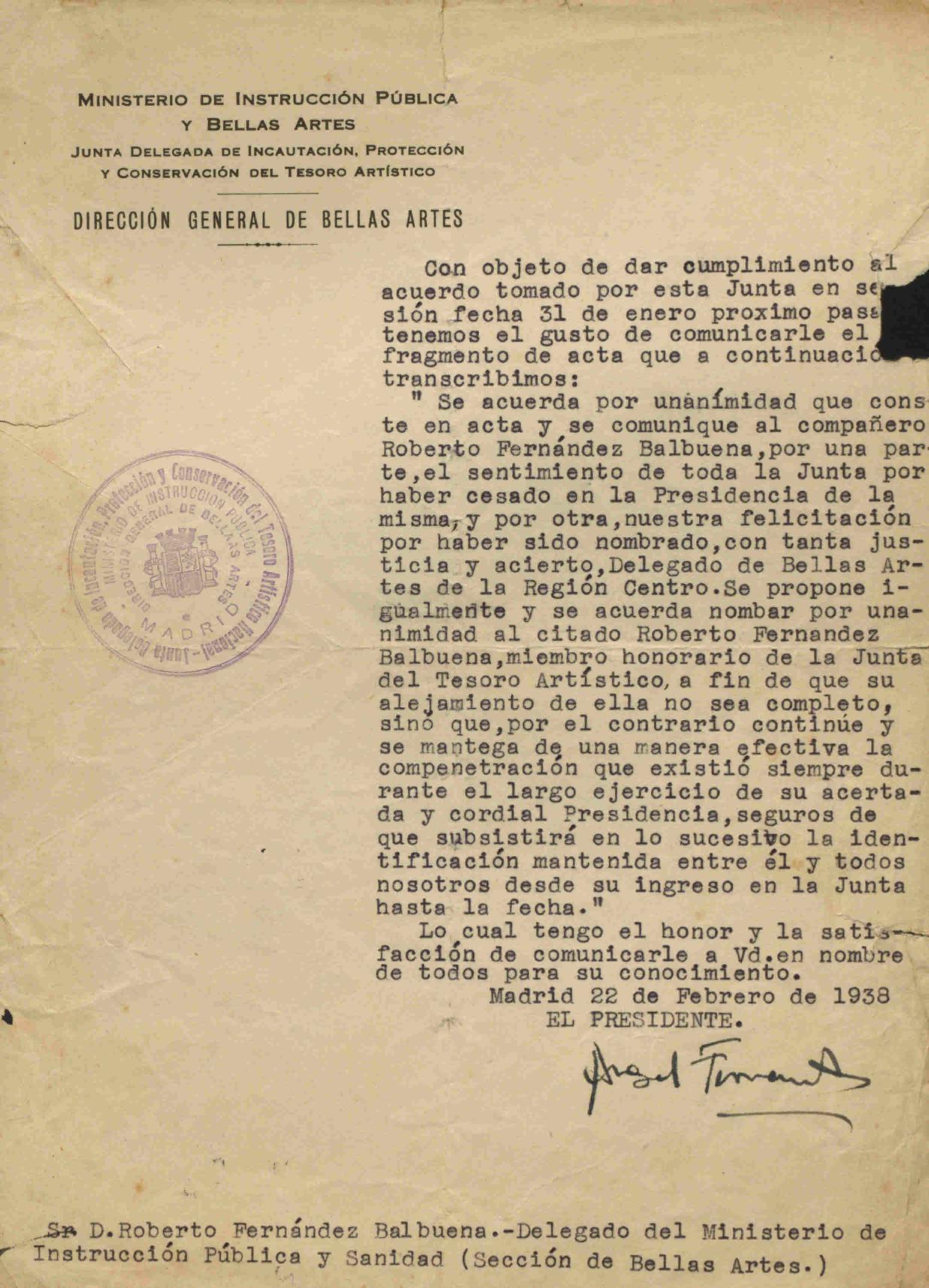 Oficio remitida por Ángel Ferrant, Presidente de la Junta Delegada de Incautación, Protección y Conservación del Tesoro Artístico, dirigido a Roberto F. B. felicitándole por su nombramiento como Delegado de Bellas Artes de la Región Centro y Miembro Honorario de la Junta, y el sentimiento de pesar de los miembros de la Junta por cesar como Presidente de la misma
