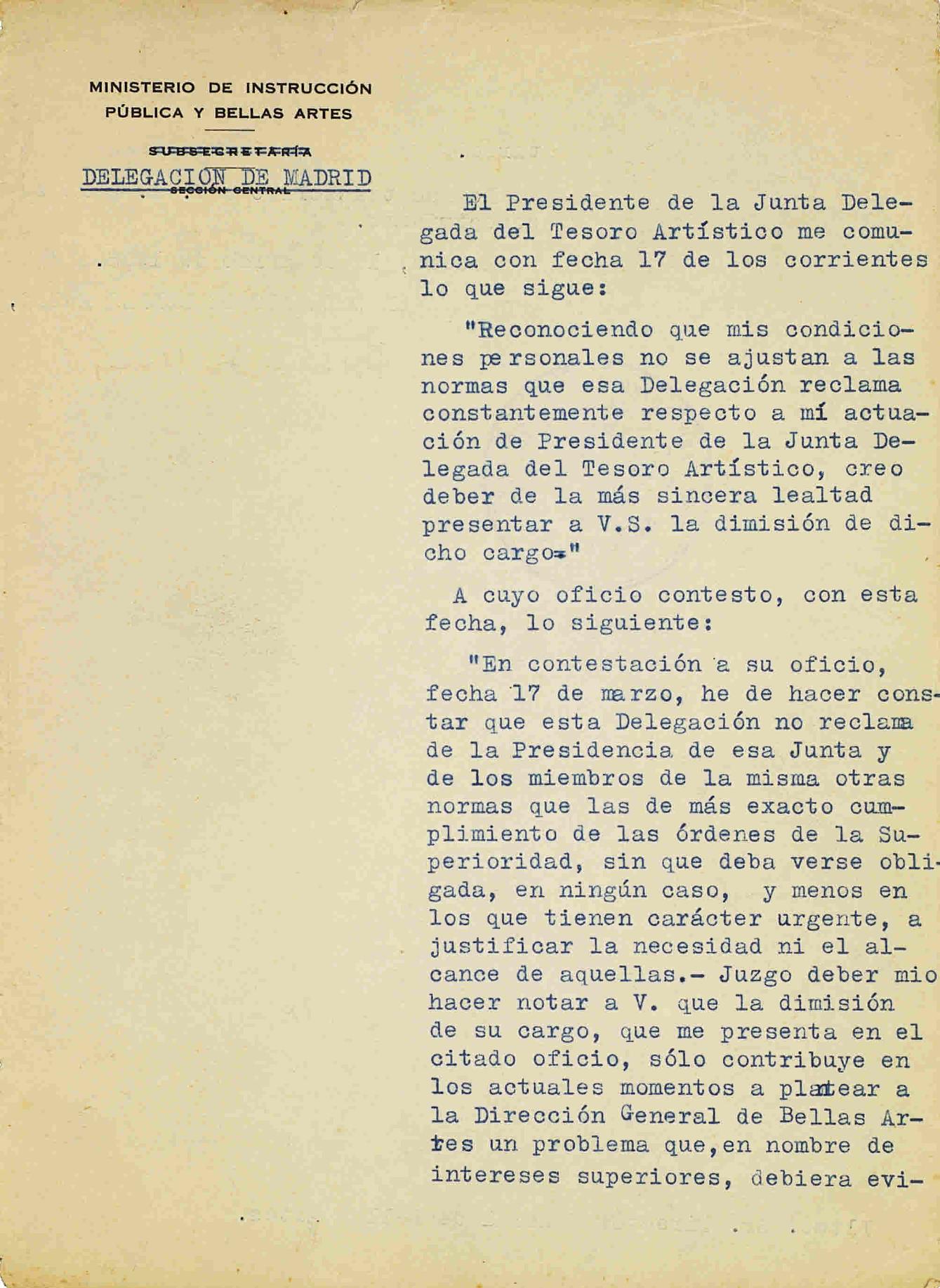 Carta dirigida al Ilmo. Sr. Director General de Bellas Artes en la que El Delegado de Bellas Artes Roberto Fernández Balbuena le transcribe los DOC. 24 y 25