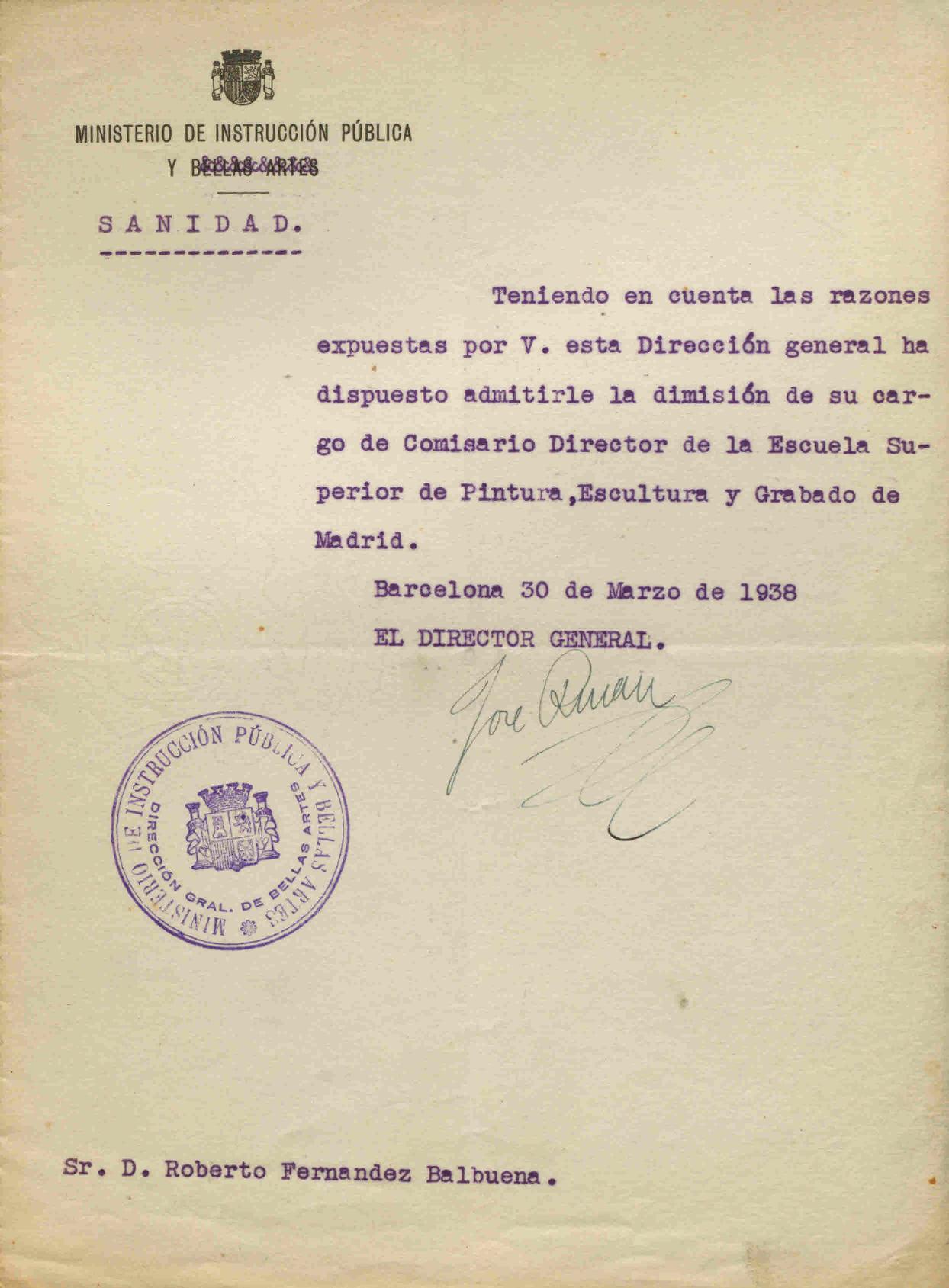 Oficio de José Renau, Director General del Ministerio de Instrucción Pública y Sanidad, dirigido a Roberto F. B. Comunicándole la aceptación de su dimisión como Comisario Director de la Escuela Superior de Pintura, Escultura y Grabado de Madrid