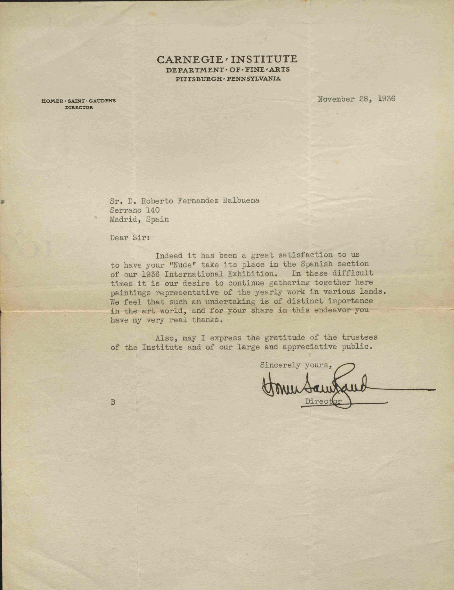 Carta del Carnegie Institute. Department of Fine Arts. Pittsburgh Pennsylvania dirigida al Sr. D. Roberto Fernández Balbuena, Serrano 140. Madrid, Spain. Recoge el agradecimiento por el cuadro "Desnudo" en la sección Española de la Exhibición Internacional 1936