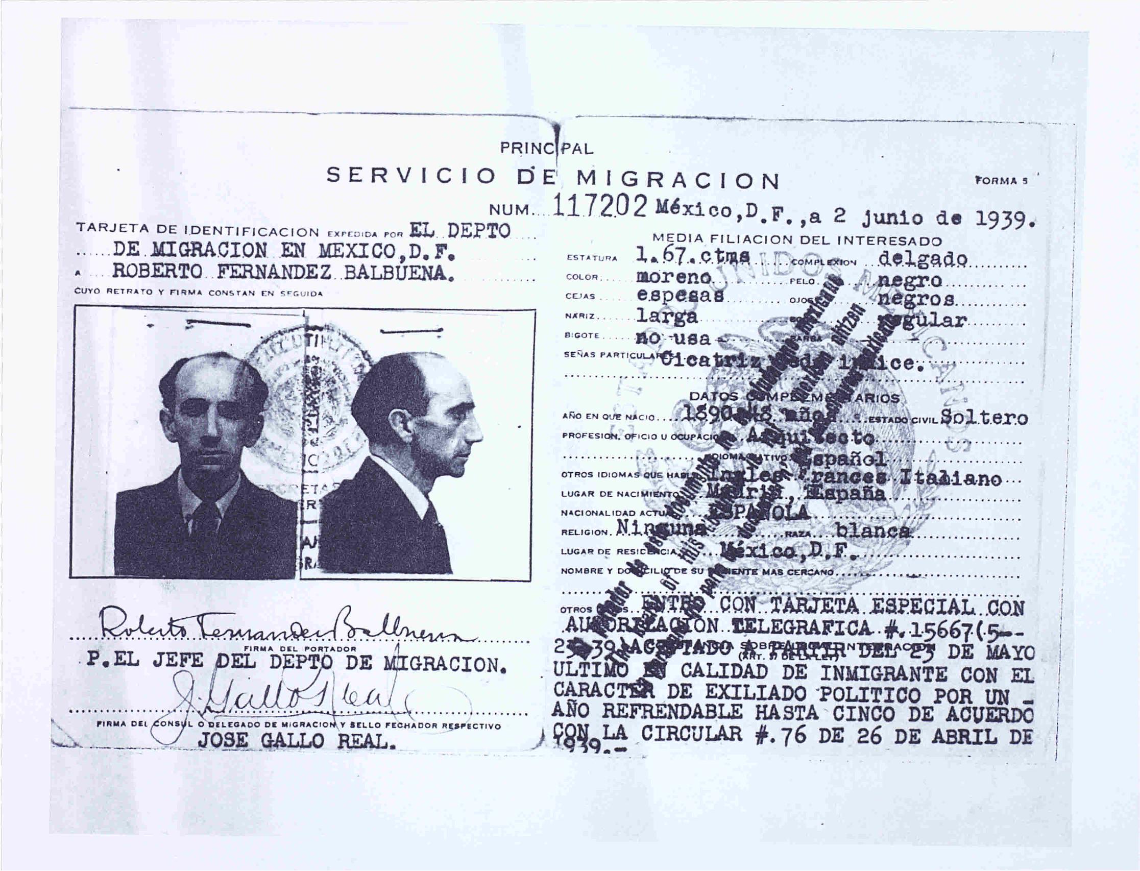 Fotocopia de la Tarjeta de Identificación expedida por el Departamento de Migración en México D.F. (Servicio de Migración) el 2 de junio de 1939 a Roberto Fernández Balbuena