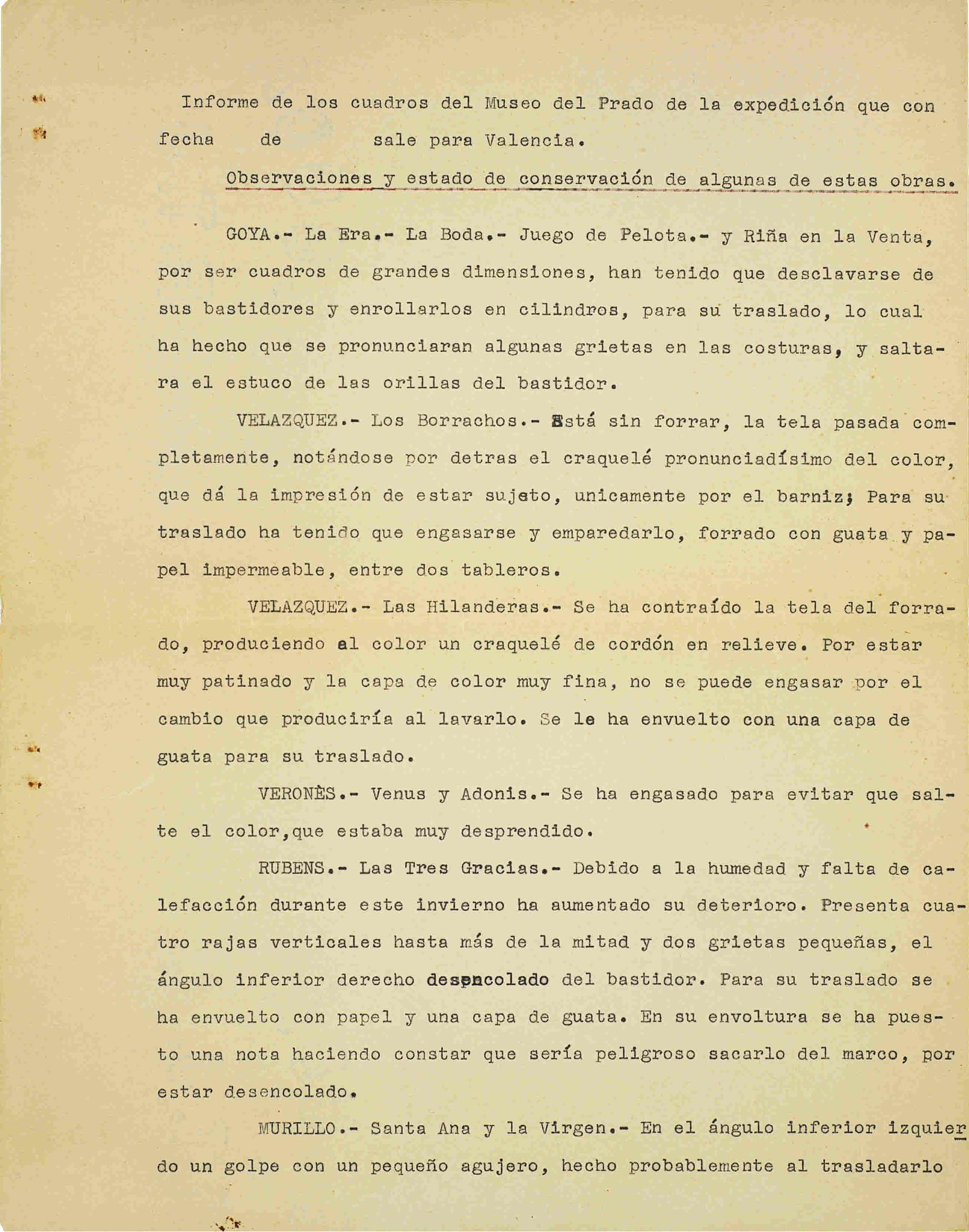 Informe de los cuadros del Museo del Prado para su traslado a Valencia