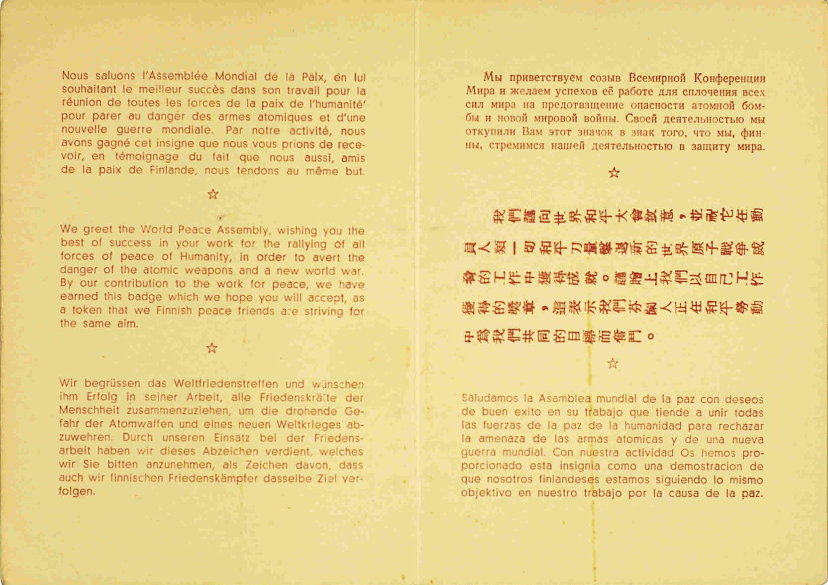 Tarjeta de Tyyne Lehtinen, expedida por la Asamblea Mundial de la Paz, Helsinki, fechada el 18 de junio de 1955