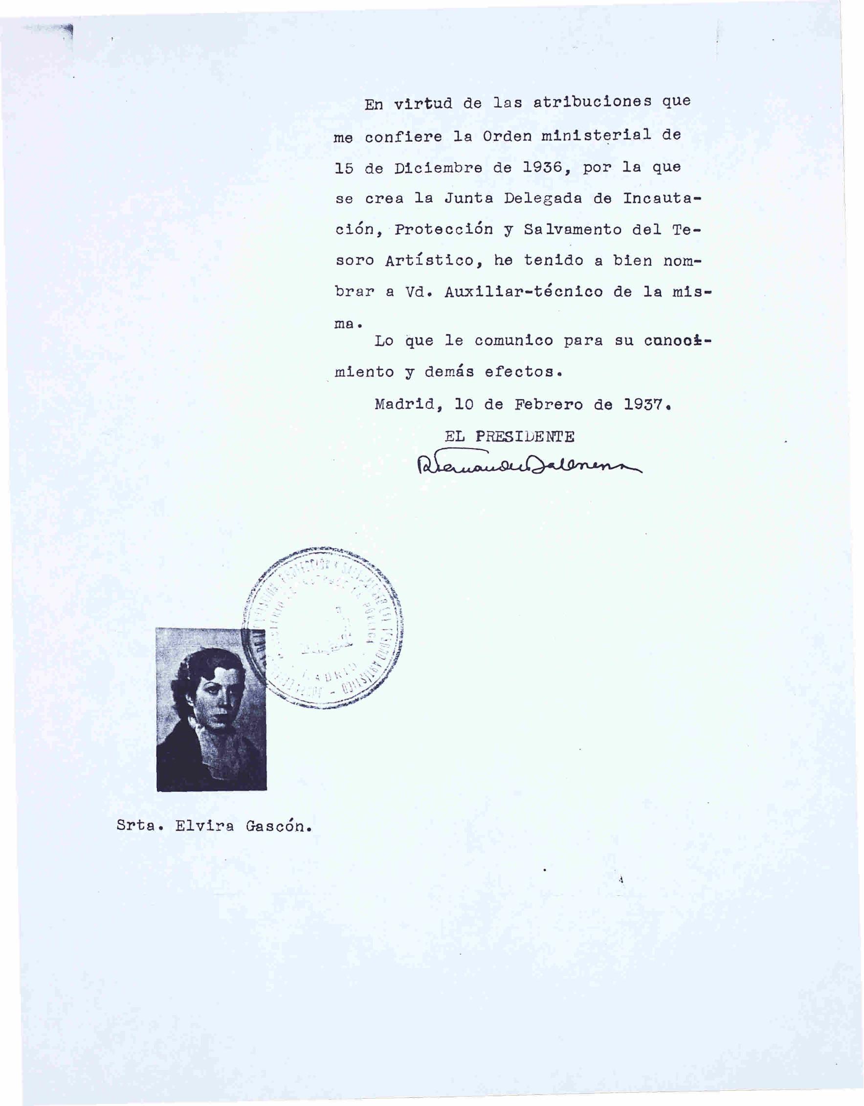 Nombramiento de la Srta. Elvira Gascón Auxiliar-técnico de la Junta Delegada de Incautación, Protección y Salvamento del Tesoro Artístico, firmado por el Presidente de la Junta Roberto Fernández Balbuena, en Madrid el 10 de febrero de 1937