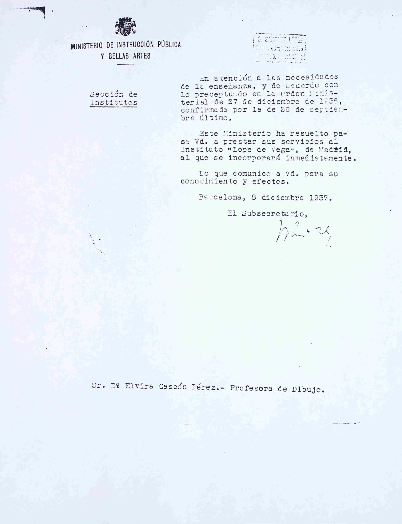 Carta del Ministerio de Instrucción Pública y Bellas Artes. Sección de Institutos dirigida a Dña. Elvira Gascón Pérez. Profesora de Dibujo, notificándole su destino al Instituto "Lope de Vega" de Madrid