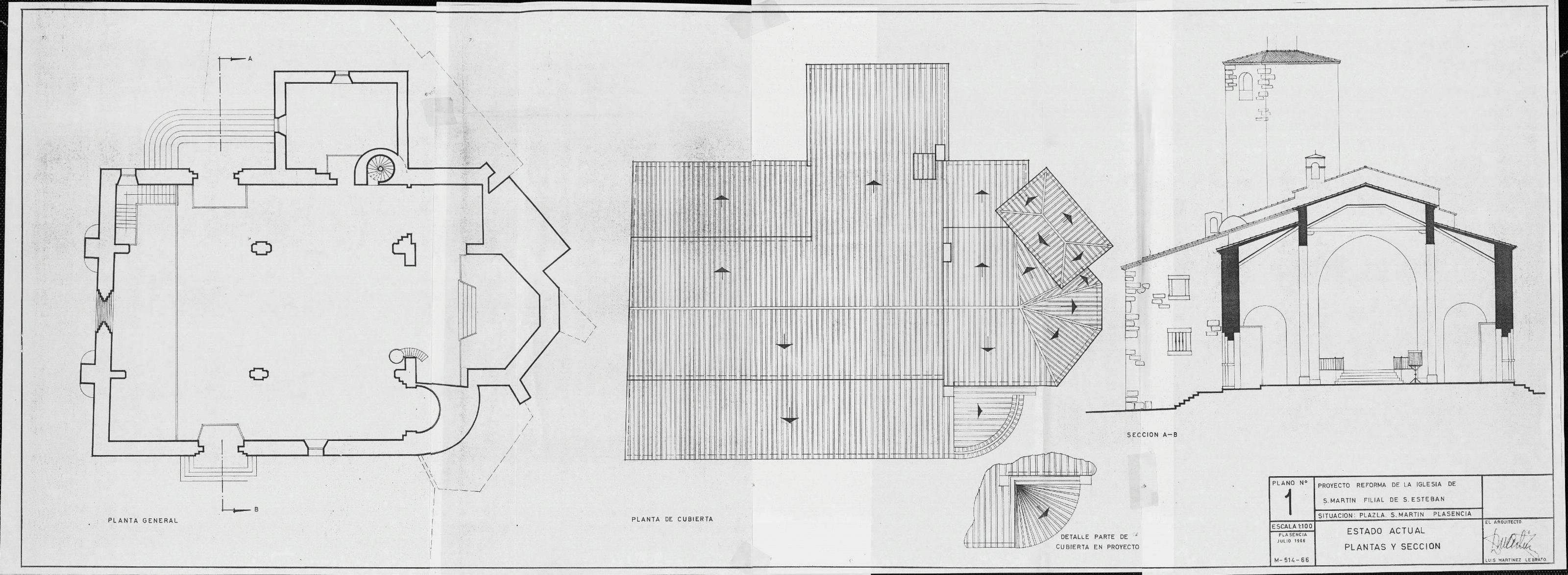 IGLESIA DE SAN MARTIN FILIAL DE SAN ESTEBAN (PLAZA DE SAN MARTIN): PLANO Nº 1. PLANTAS: GENERAL, CUBIERTA Y SECCION A-B