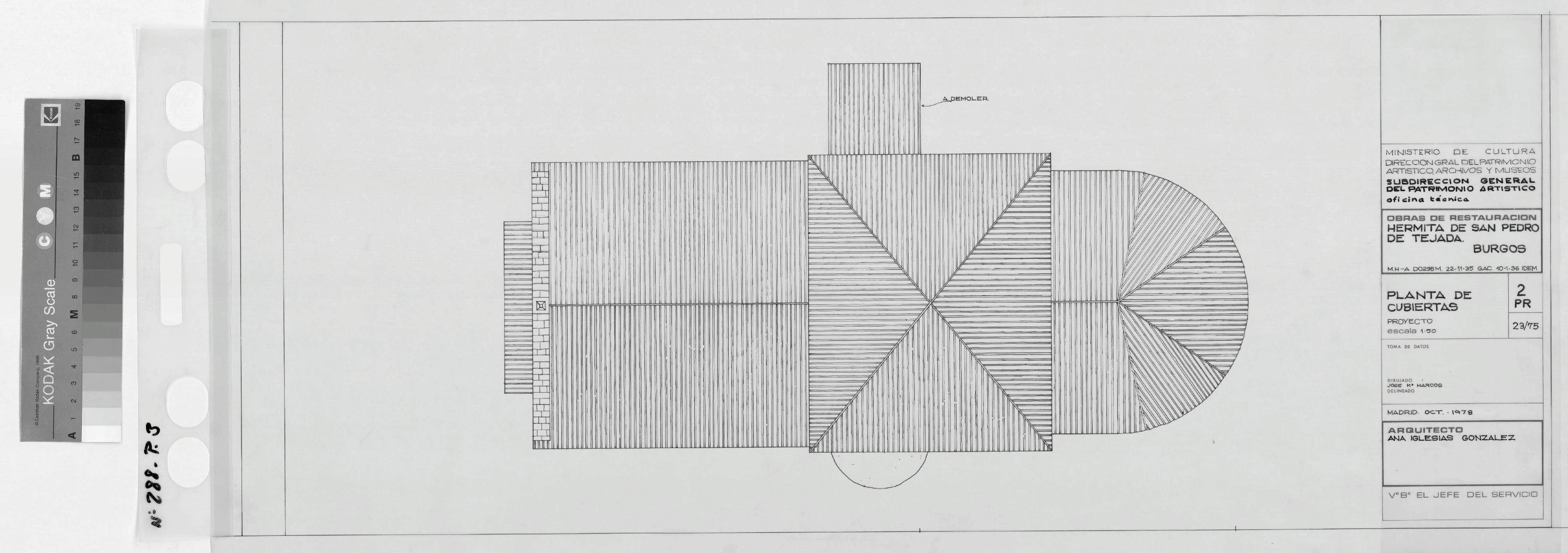 ERMITA DE SAN PEDRO DE TEJADA -BURGOS-: PLANTA. DE CUBIERTAS. PROYECTO. Planta cubiertas aparecen una zona de la cubierta a demoler. plano sin cotas.