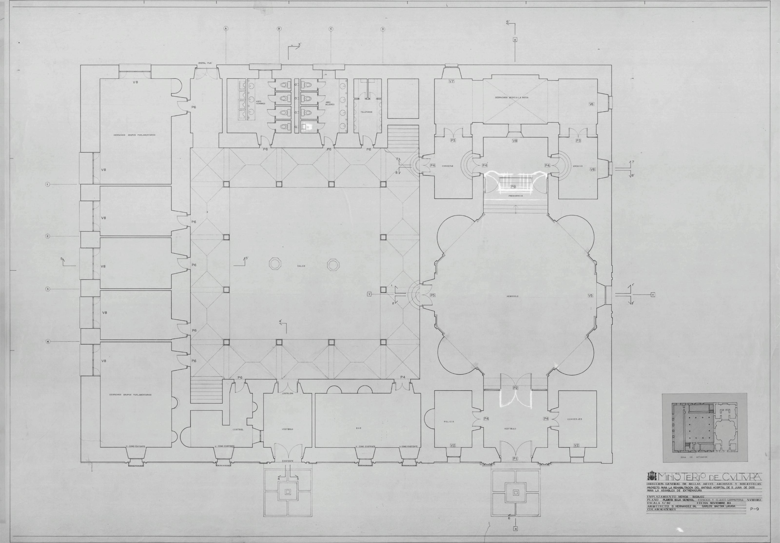 ASAMBLEA DE EXTREMADURA PROYECTO DE REHABILITACIÓN DEL ANTIGUO HOSPITAL DE S. JUAN DE DIOS PARA SEDE DE LA ASAMBLEA: PLANTA BAJA - ESPACIOS Y CLAVES CARPINTERIA Especifica el uso al que se destina cada estancia Señala cada carpintería con un código para identificarla en memoria Con Líneas de sección 1-1¿, 2-2¿ , 3-3¿, 4-4¿, 5-5¿, 6-6¿, 7-7¿ y 8-8¿ y varias llamadas con letra y círculo en fachada. Sin firmar