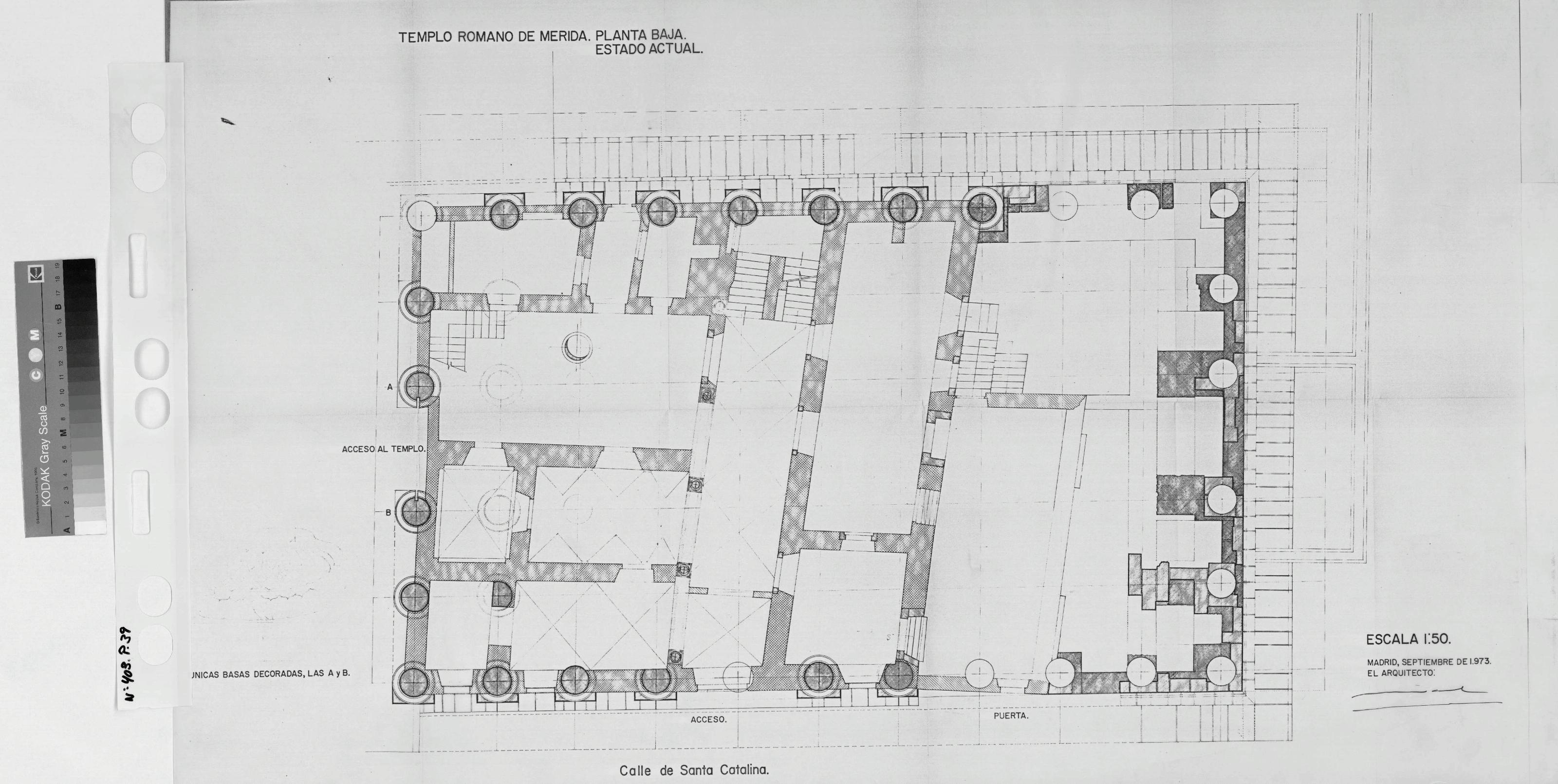 OBRAS DE RESTAURACION EN EL TEMPLO ROMANO DE MERIDA (Badajoz): PLANTA BAJA ESTADO ACTUAL Con especificación de basas decoradas Con rallados de muros y columnas Parece que es el plano base sobre el que se ha desarrollado el resto No parece plano de proyecto. Sin sello ni recuadro. Firmado