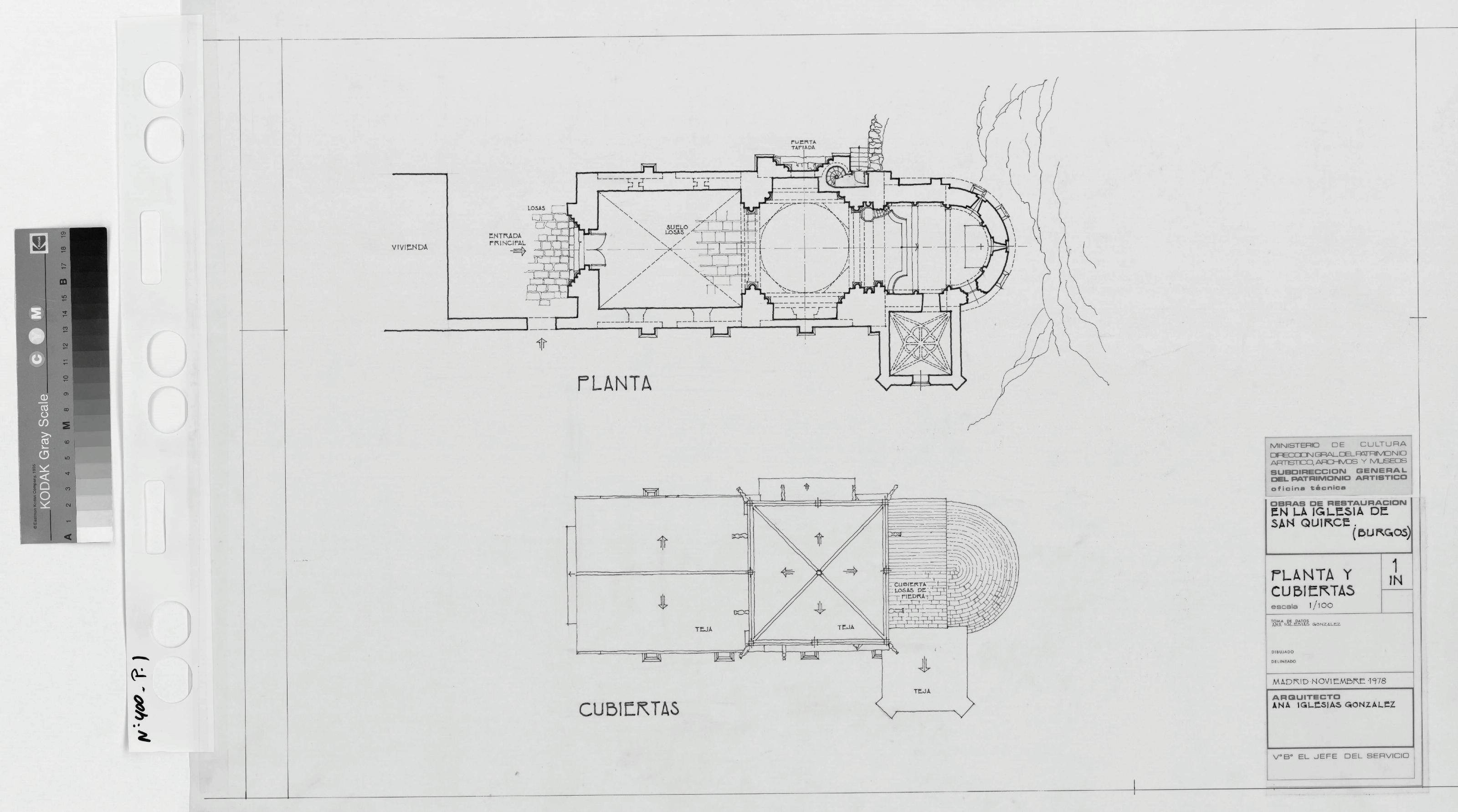 IGLESIA DE SAN QUIRCE. - BURGOS -: PLANTA Y CUBIERTAS. Planta general, con proyeccion de bovedas y techos, tambien marca una zona de pavimentos, muros regruesados. Planta de cubiertas, en esta planta vemos dibujadas las pendientes de agua y una cubierta de losas y piedras. Plano sin cotas.
