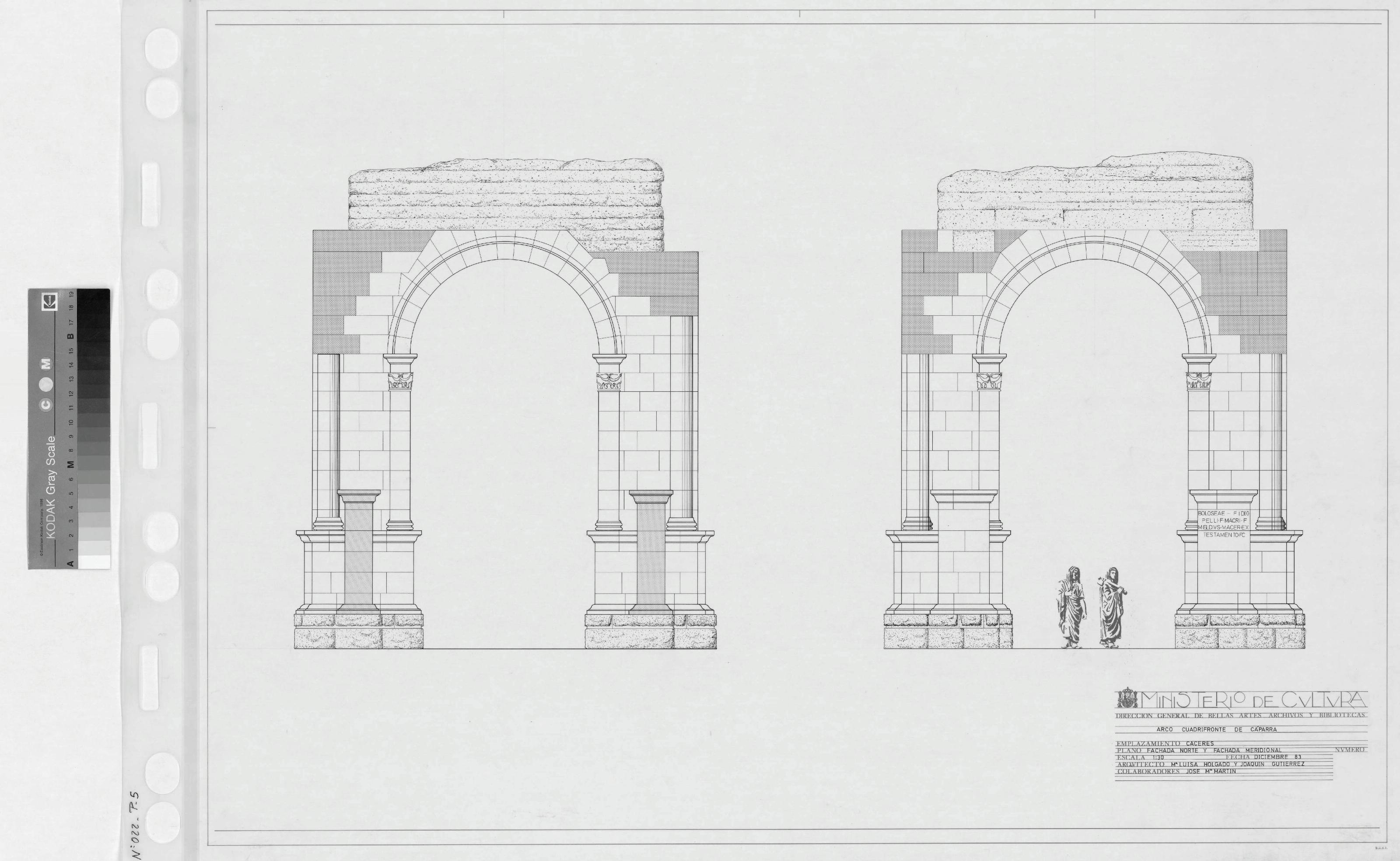 ARCO CUADRIFRONTE DE CAPARRA: FACHADAS NORTE Y MERIODIONAL, PLANO SIN COTAS. PLANO REALIZADO POR PERSONAL CONTRATADO POR EL INEM.