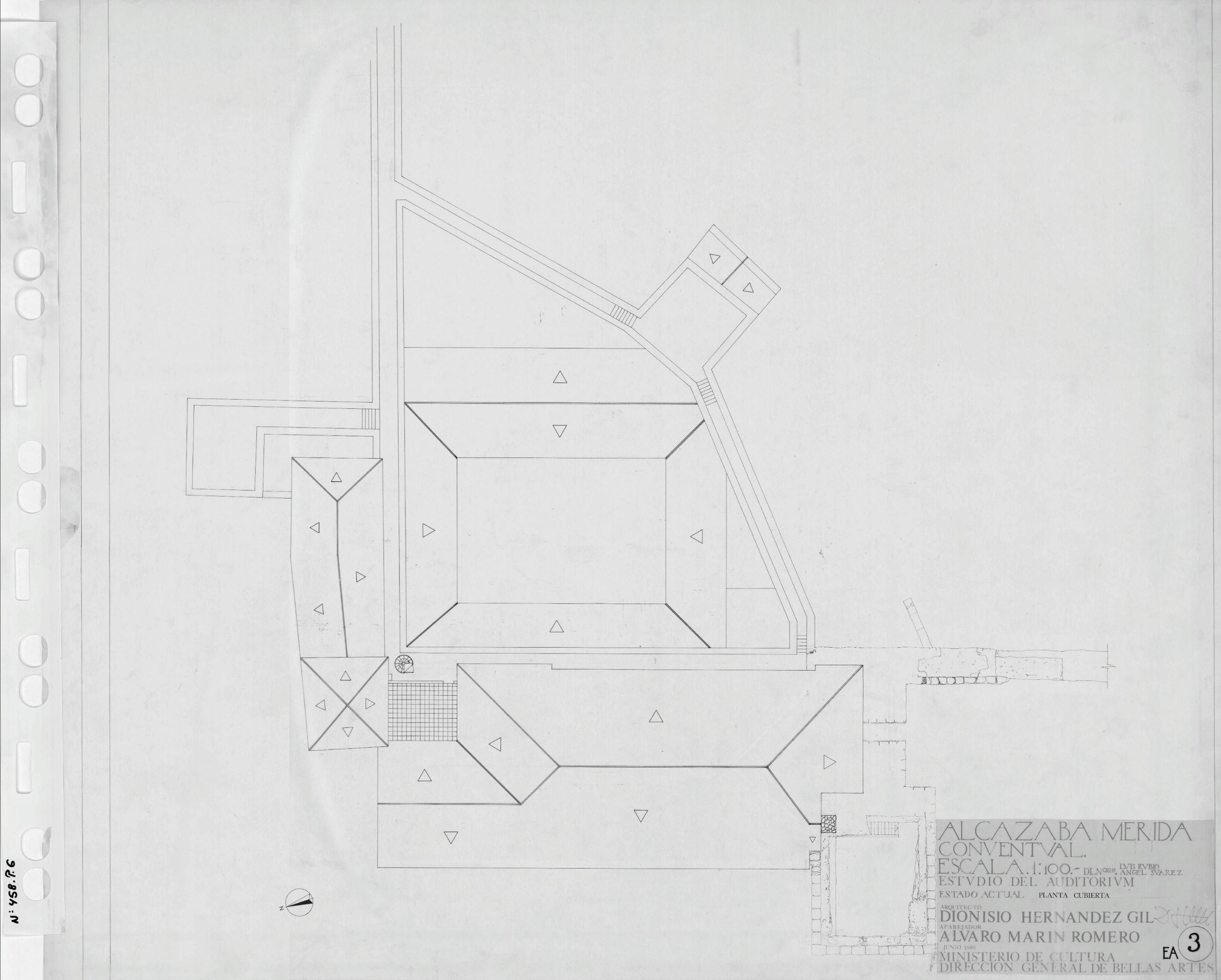 ALCAZABA DE MERIDA (Badajoz) Estudio del Auditorium: PLANTA DE CUBIERTA Estado actual Marca las pendientes y algún resto de construcción aneja. Sin cotas ni notas. Firmado