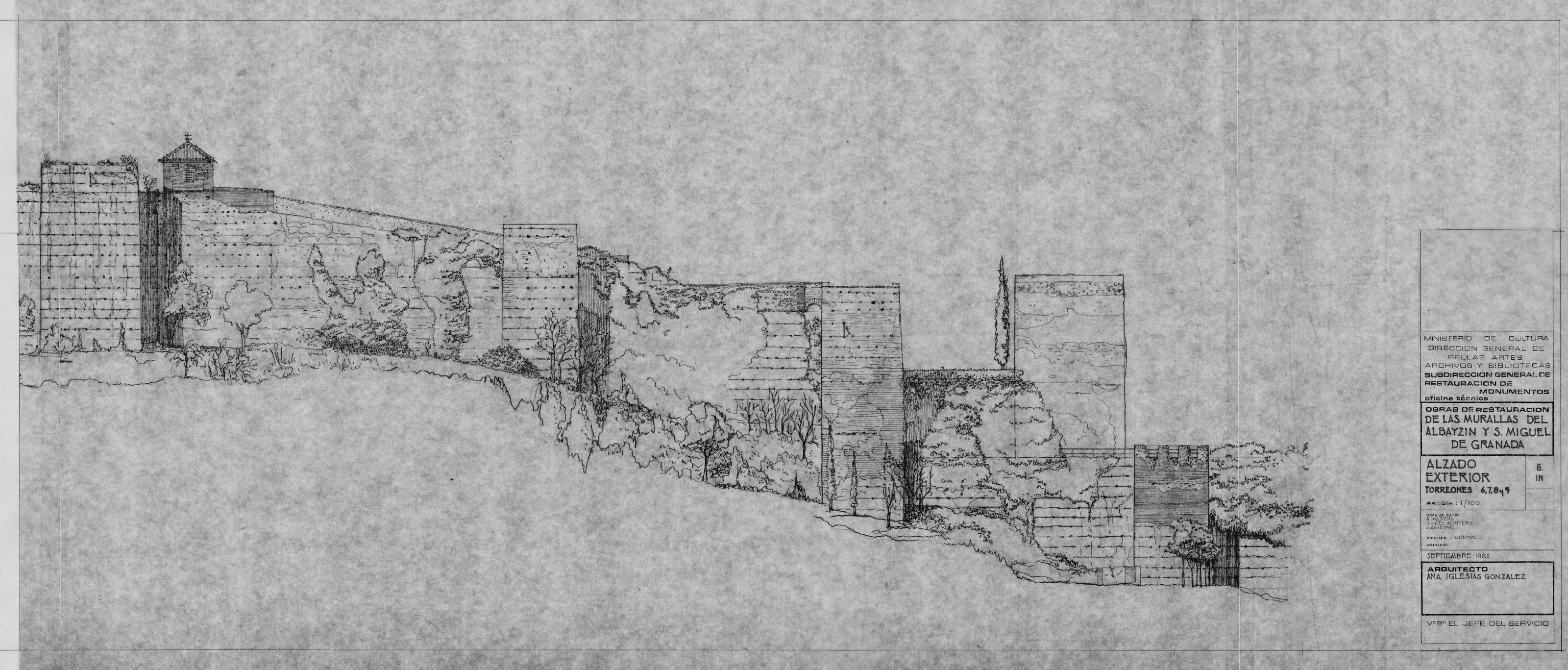 MURALLAS DEL ALBAYCIN Y SAN MIGUEL.- GRANADA-: ALZADO EXTERIOR. TORREONES 6, 7, 8, y 9. En este plano tenemos dibujados los torreones y parte de la muralla, plano sin acotar.