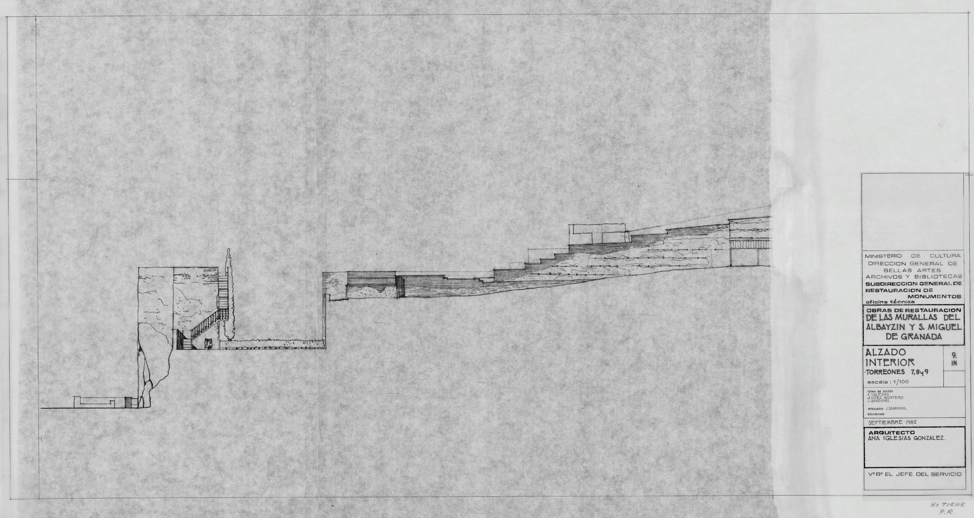 MURALLAS DEL ALBAYCIN Y SAN MIGUEL.- GRANADA-: ALZADO INTERIOR. TORREONES 7 , 8, y 9. En este plano tenemos dibujados los torreones, y parte de la muralla, plano sin acotar.