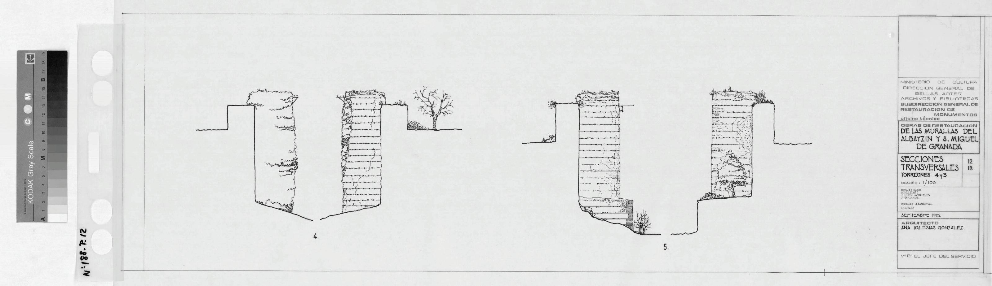 MURALLAS DEL ALBAYCIN Y SAN MIGUEL.- GRANADA-: SECCIONES TRANSVERSALES, TORREONES 4, y 5. En este plano tenemos dibujados las secciones de los torreones,y parte de la muralla, plano sin acotar.
