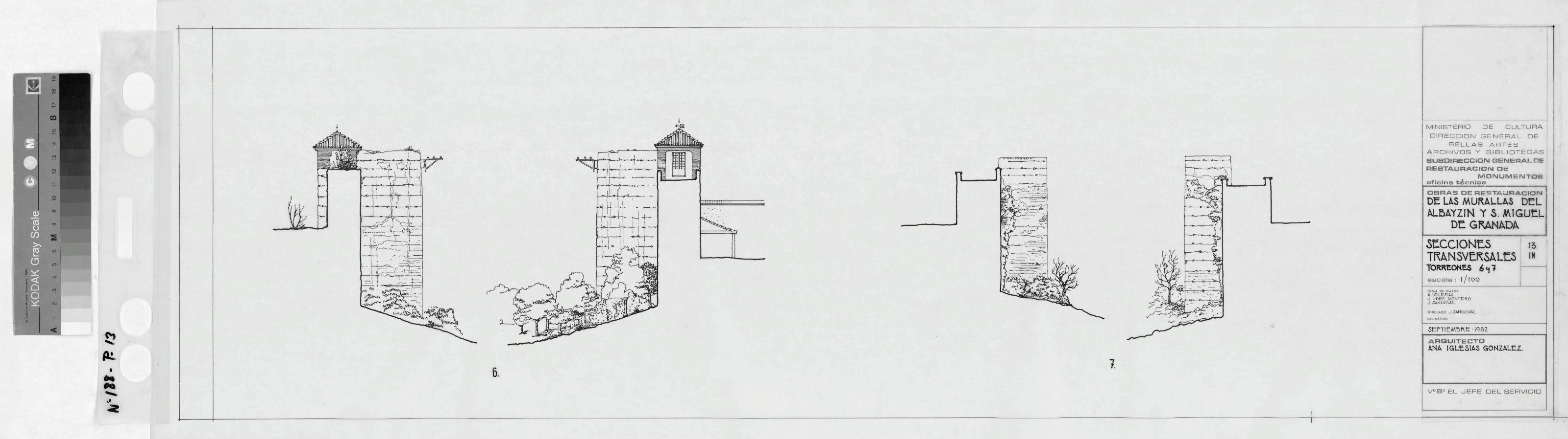MURALLAS DEL ALBAYCIN Y SAN MIGUEL.- GRANADA-: SECCIONES TRANSVERSALES, TORREONES 6 y 7. En este plano tenemos dibujados las secciones de los torreones,y parte de la muralla, plano sin acotar.