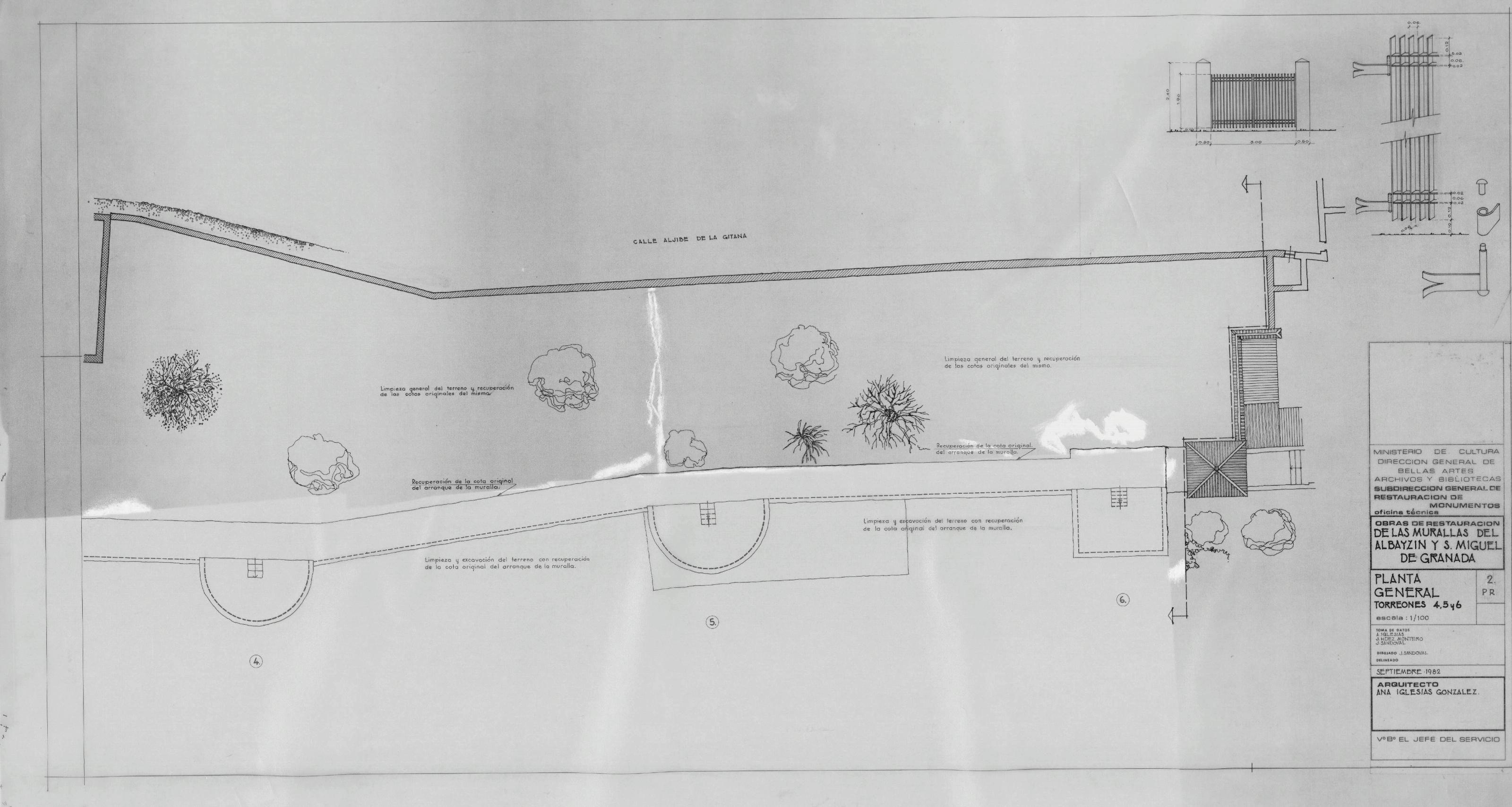 MURALLAS DEL ALBAYCIN Y SAN MIGUEL.- GRANADA-: PLANTA GENERAL, TORREONES 4, 5, Y 6 . En este plano tenemos dibujados, las actuaciones a realizar.como: limpieza general del terreno, excavaciones,recuperacion de muralla... Detalle de puerta. plano sin acotar.