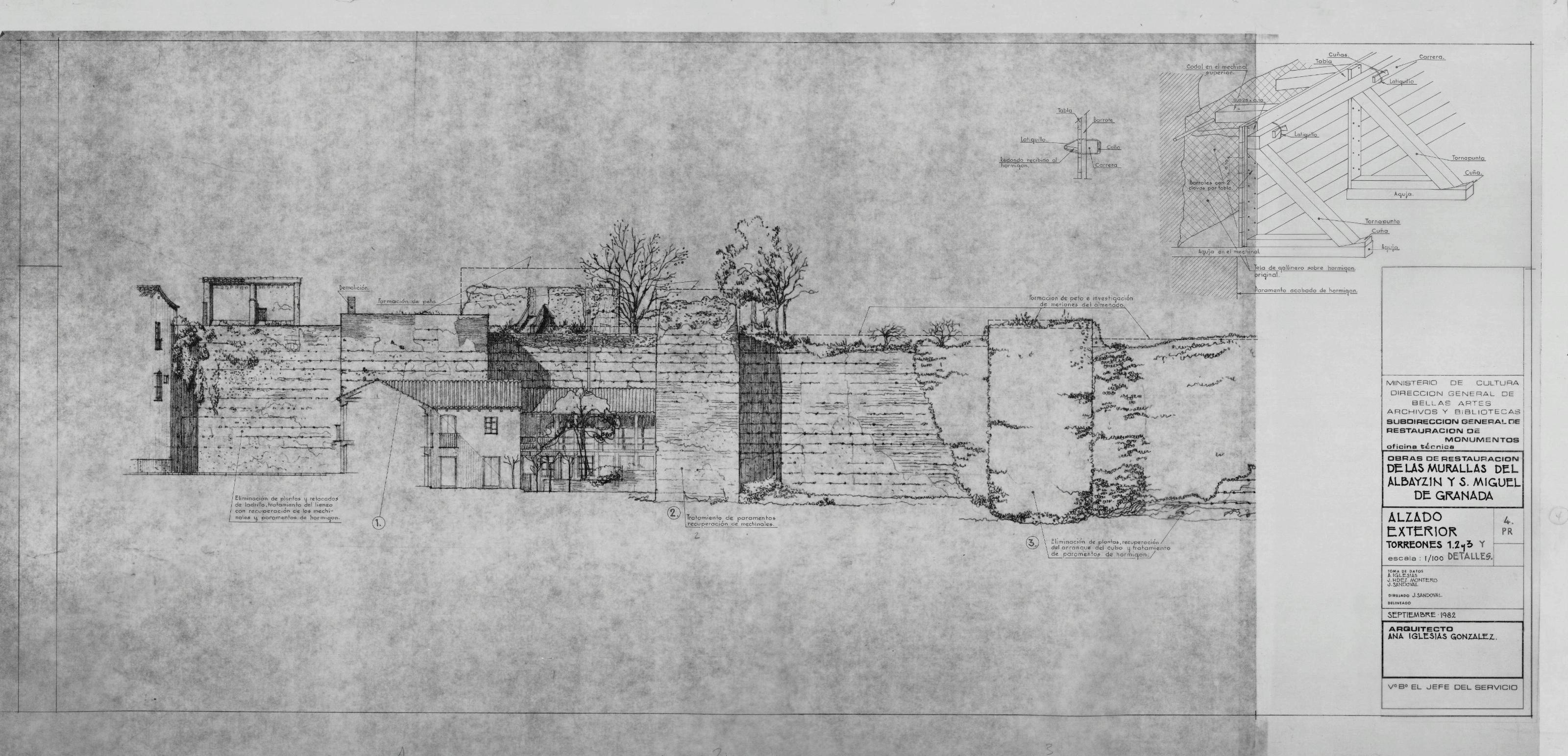 MURALLAS DEL ALBAYCIN Y SAN MIGUEL.- GRANADA-: ALZADO EXTERIOR, TORREONES 1, 2, Y 3 DETALLES. En este plano tenemos dibujados, las actuaciones a realizar.como: Formacion de peto, eliminacion de plantas, recuperacion del arranque del cubo y limpieza general del paramento... Detalle de preparacion de muro. plano sin acotar.