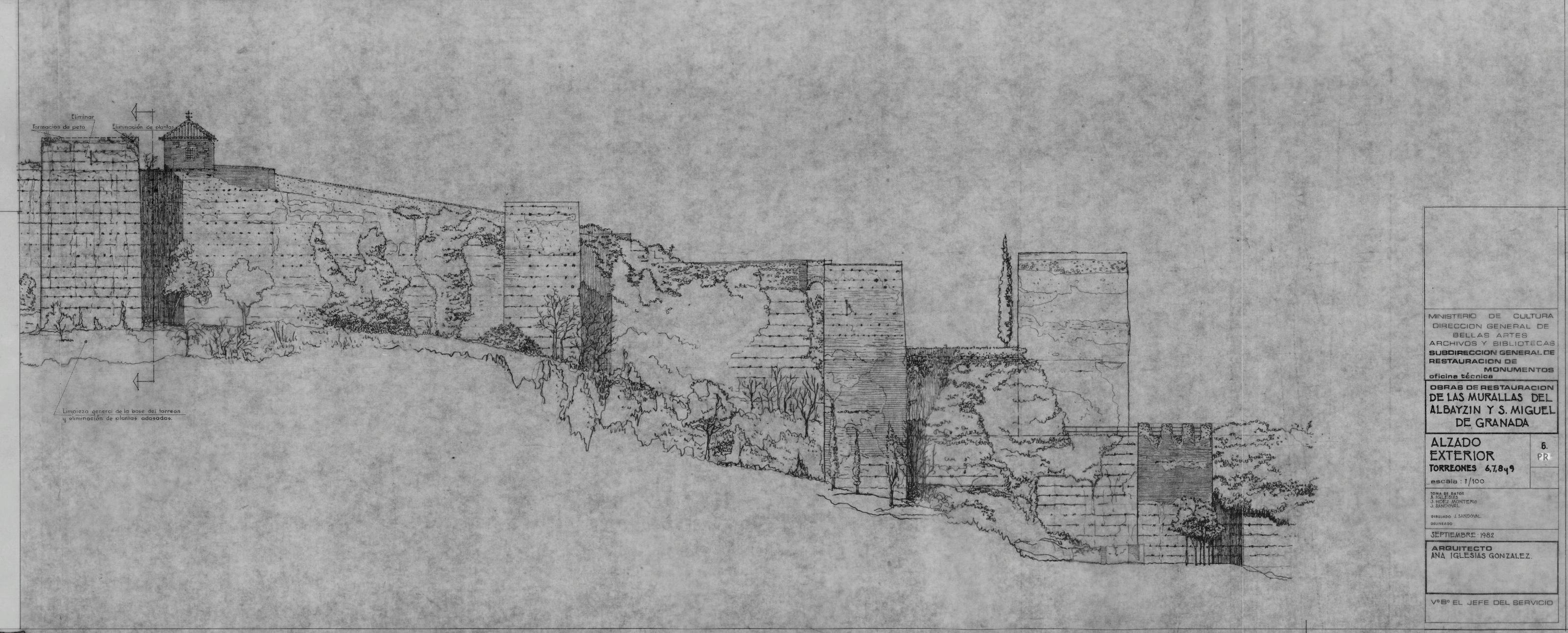 MURALLAS DEL ALBAYCIN Y SAN MIGUEL.- GRANADA-: ALZADO EXTERIOR, TORREONES 6,7,8, Y 9 En este plano tenemos dibujados, las actuaciones a realizar.como: Formacion de peto, eliminacion de plantas, recuperacion del arranque del cubo y limpieza general del paramento... plano sin acotar.