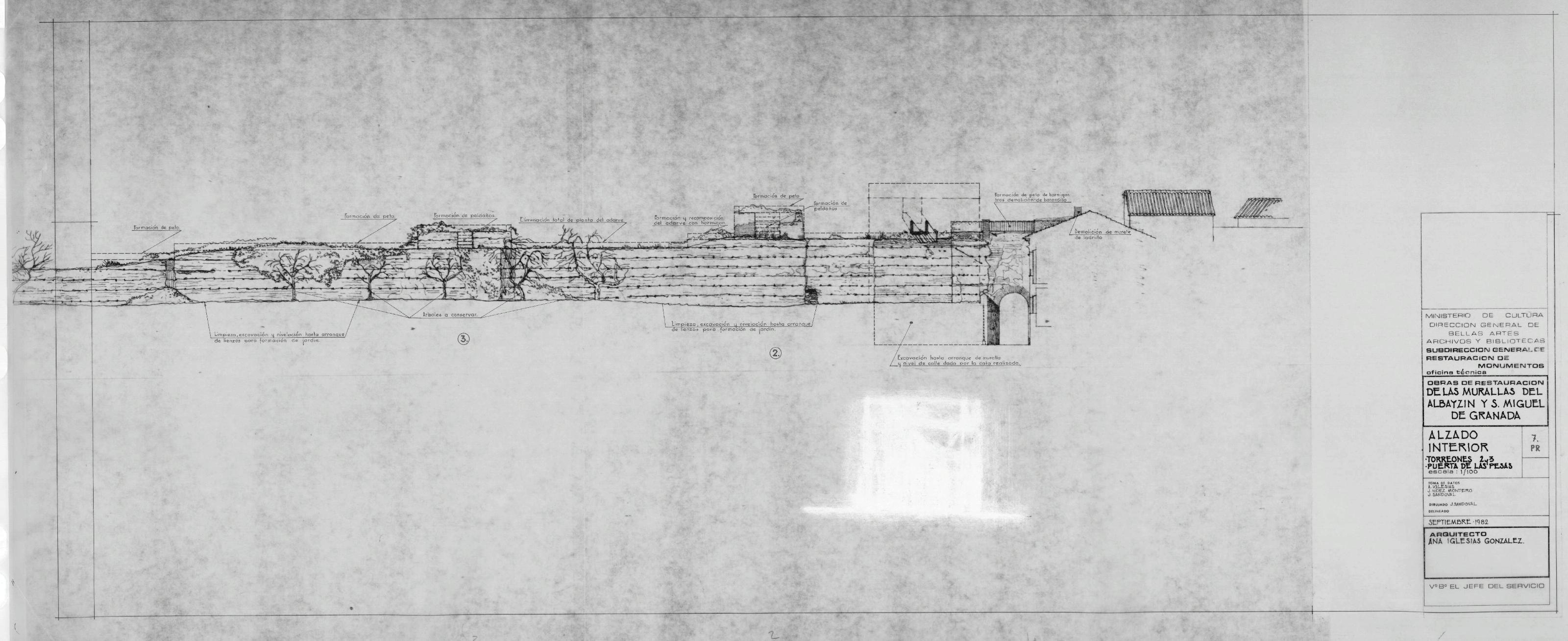 MURALLAS DEL ALBAYCIN Y SAN MIGUEL.- GRANADA-: ALZADO INTERIOR, TORREONES 2, Y 3 PUERTA DE LAS PESAS. En este plano tenemos dibujados, las actuaciones a realizar.como: Formacion de peto, eliminacion de plantas, Excavacion hasta arranque de muralla, y limpieza general del paramento... plano sin acotar.